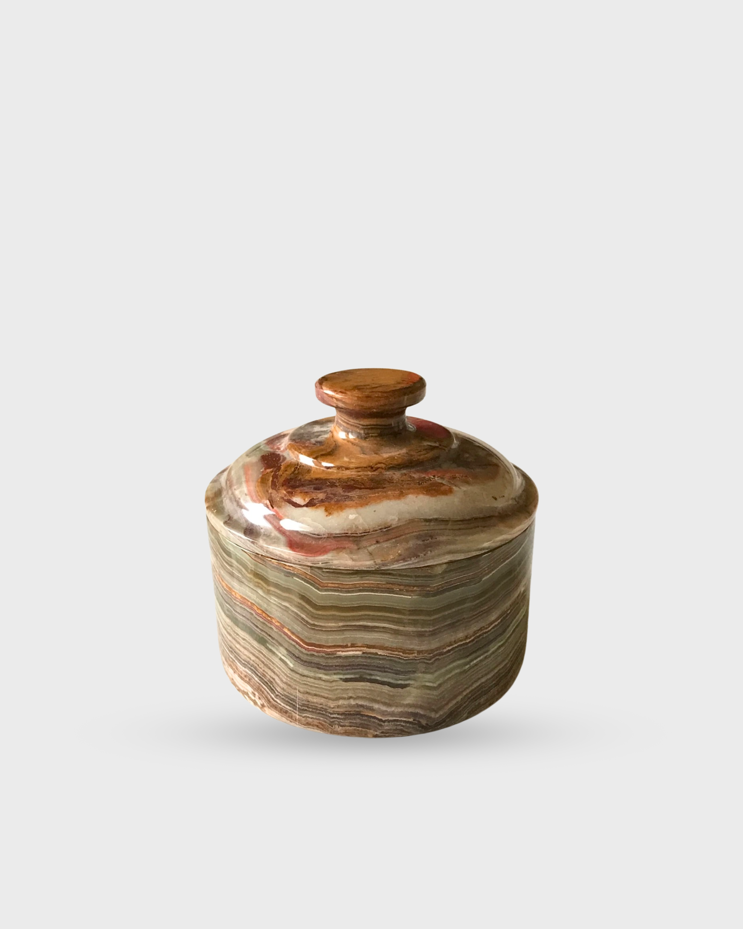 This Onyx Round Jewelry Box features mesmerizing earth-toned layers of green, amber, and cream, hand-carved from natural onyx. A timeless keepsake piece that beautifully holds your treasures while grounding any space with its serene energy.