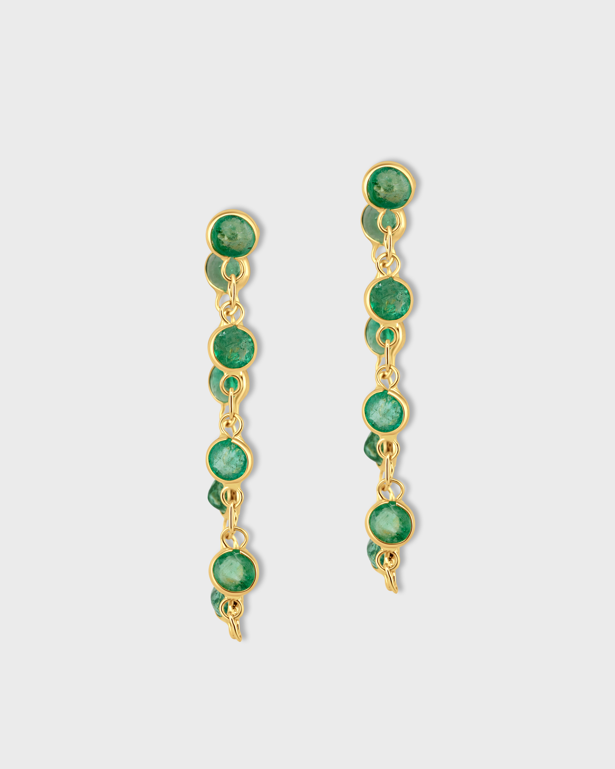 Stunning gold bezel emerald dangle drop earrings that can be worn in multiple ways. Worn long and worn wrapped. Beautiful on its own or layered with other earrings for an ear stack.