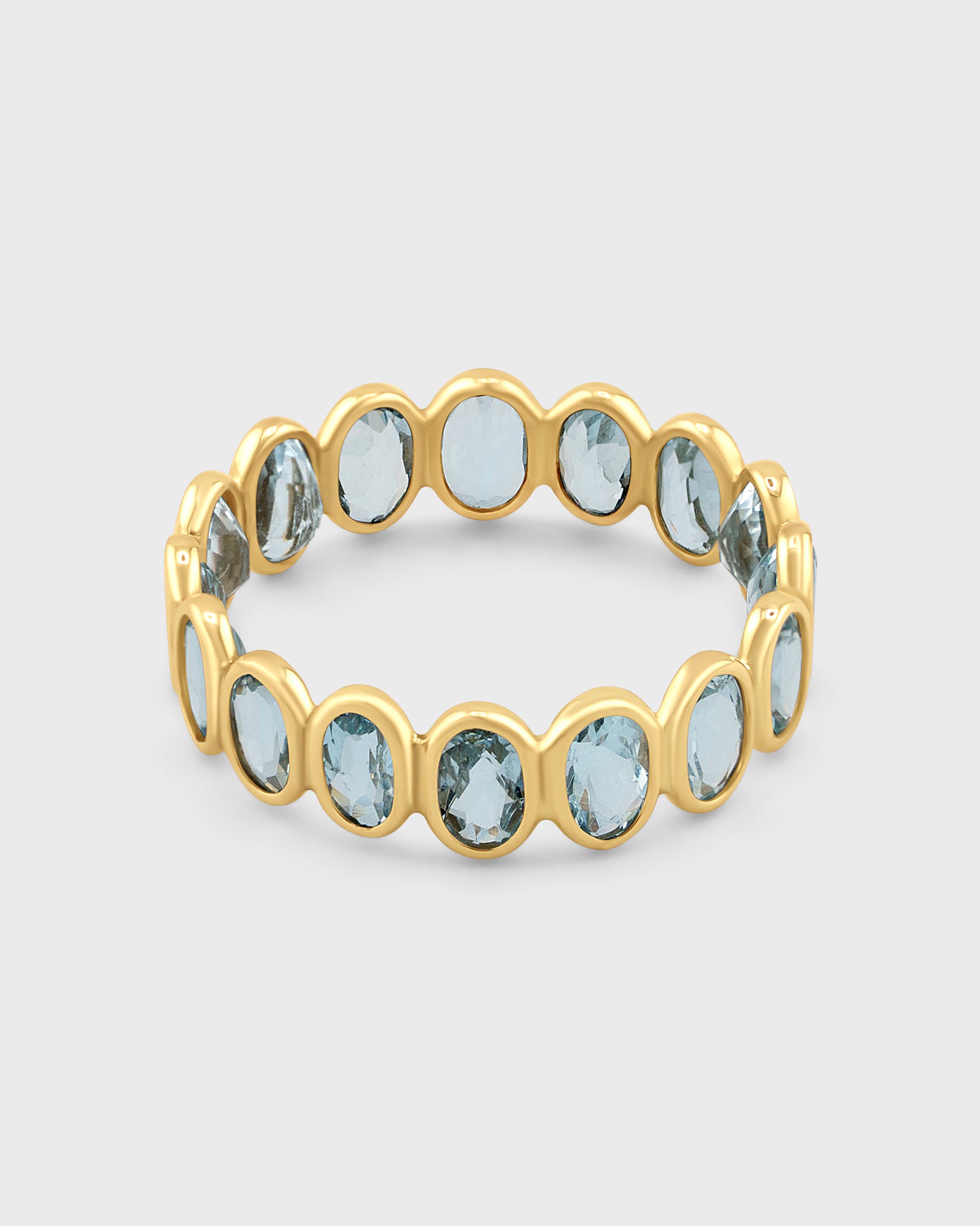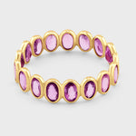A stunning piece handcrafted in NYC. This elegant 14k gold ring features a continuous circle of oval pink sapphires, each delicately embraced by a gold bezel setting. The soft pink hues of the pink sapphires create a mesmerizing effect, perfect for adding a touch of serene luxury to any outfit.