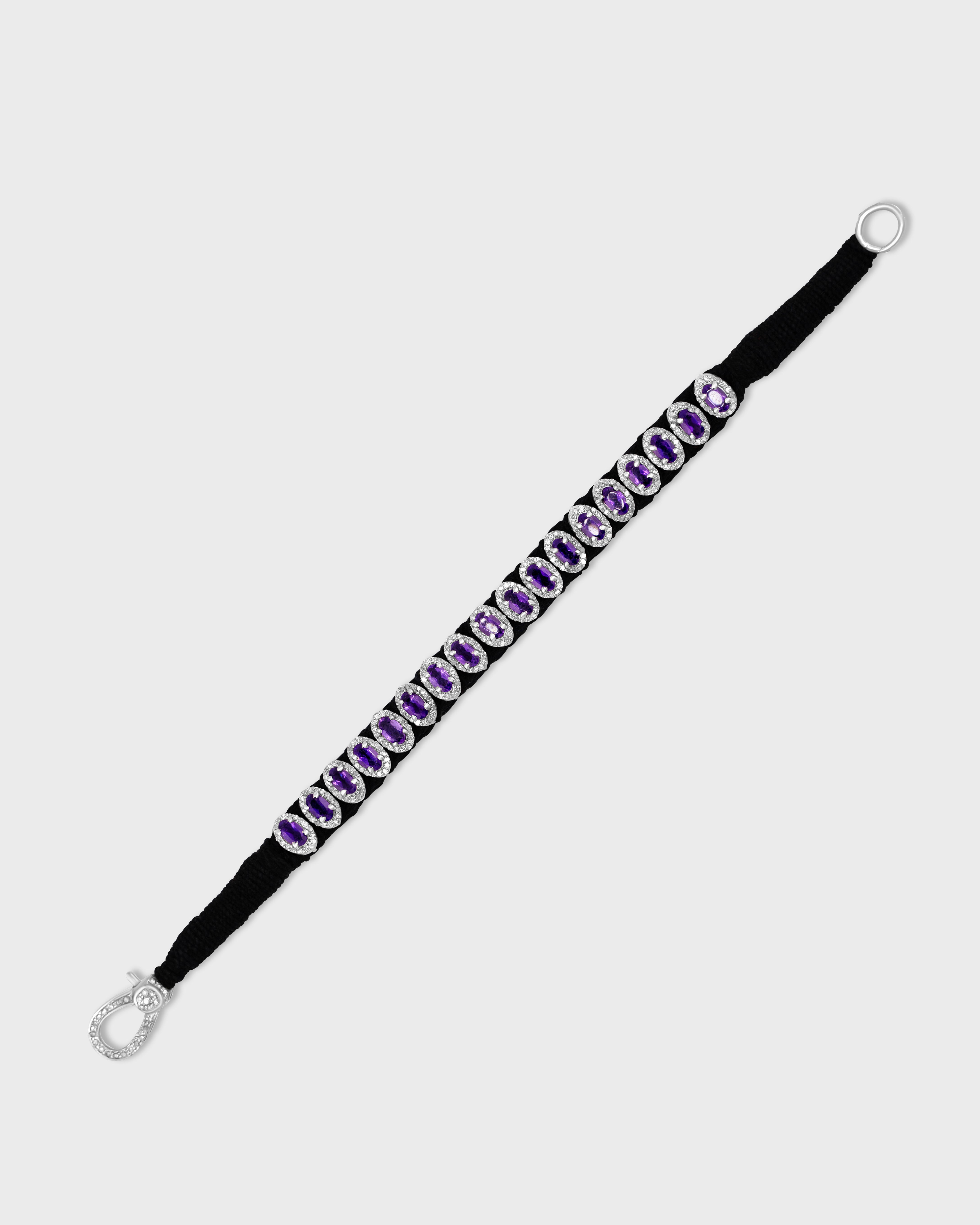 Handcrafted in NYC, this silk cotton woven bracelet features oval-cut amethyst framed by sparkling diamonds.