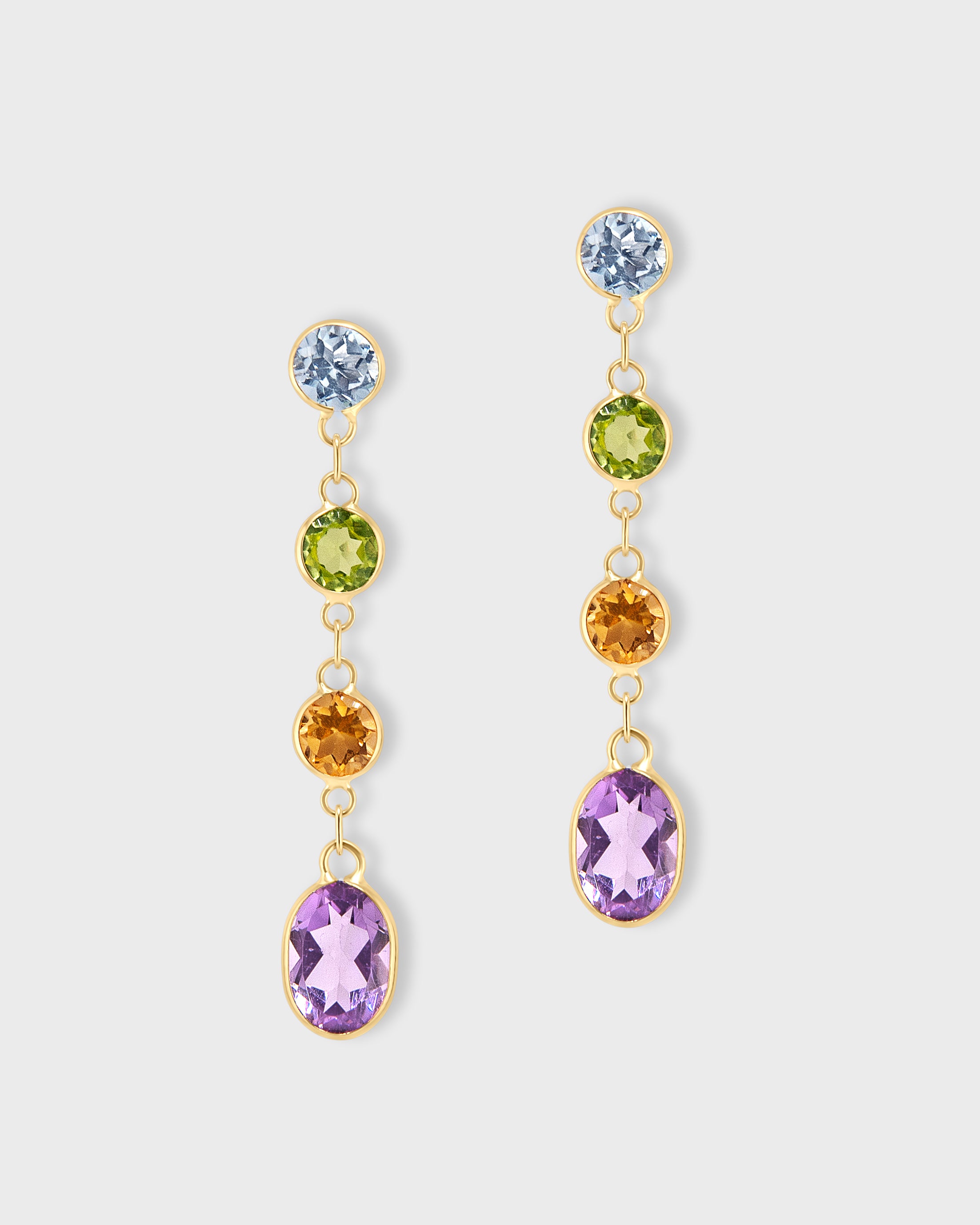 Stunning multi gemstones in rich, oval cuts dangle gracefully from a delicate gold chain, radiating warmth and depth. These earrings are an ideal accessory for those looking to add a touch of luxury and timeless style to their ensemble.