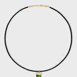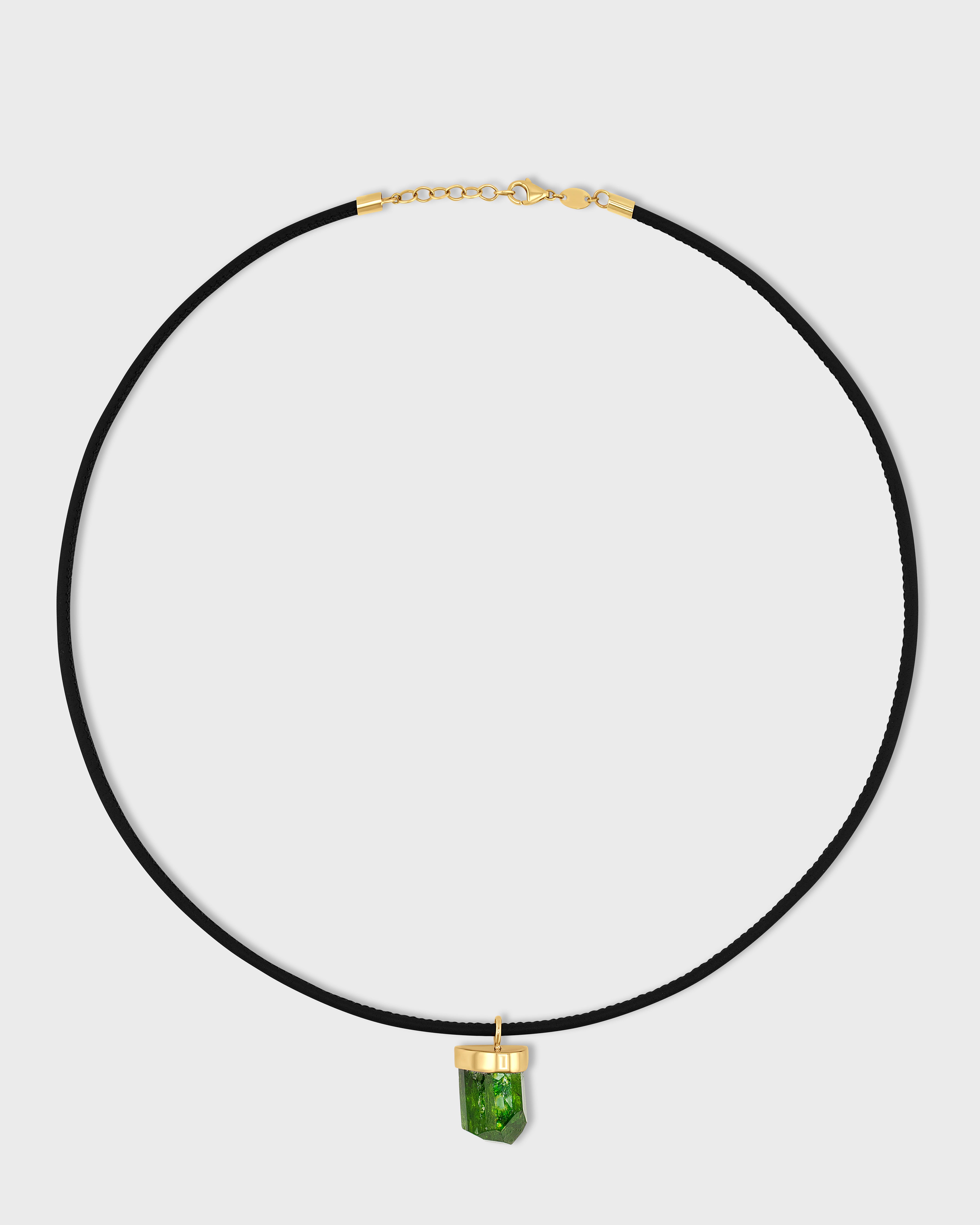 This stunning necklace features a genuine deep green tremolite gemstone charm with shimmering yellow gold cap all suspended from a delicate leather chain.