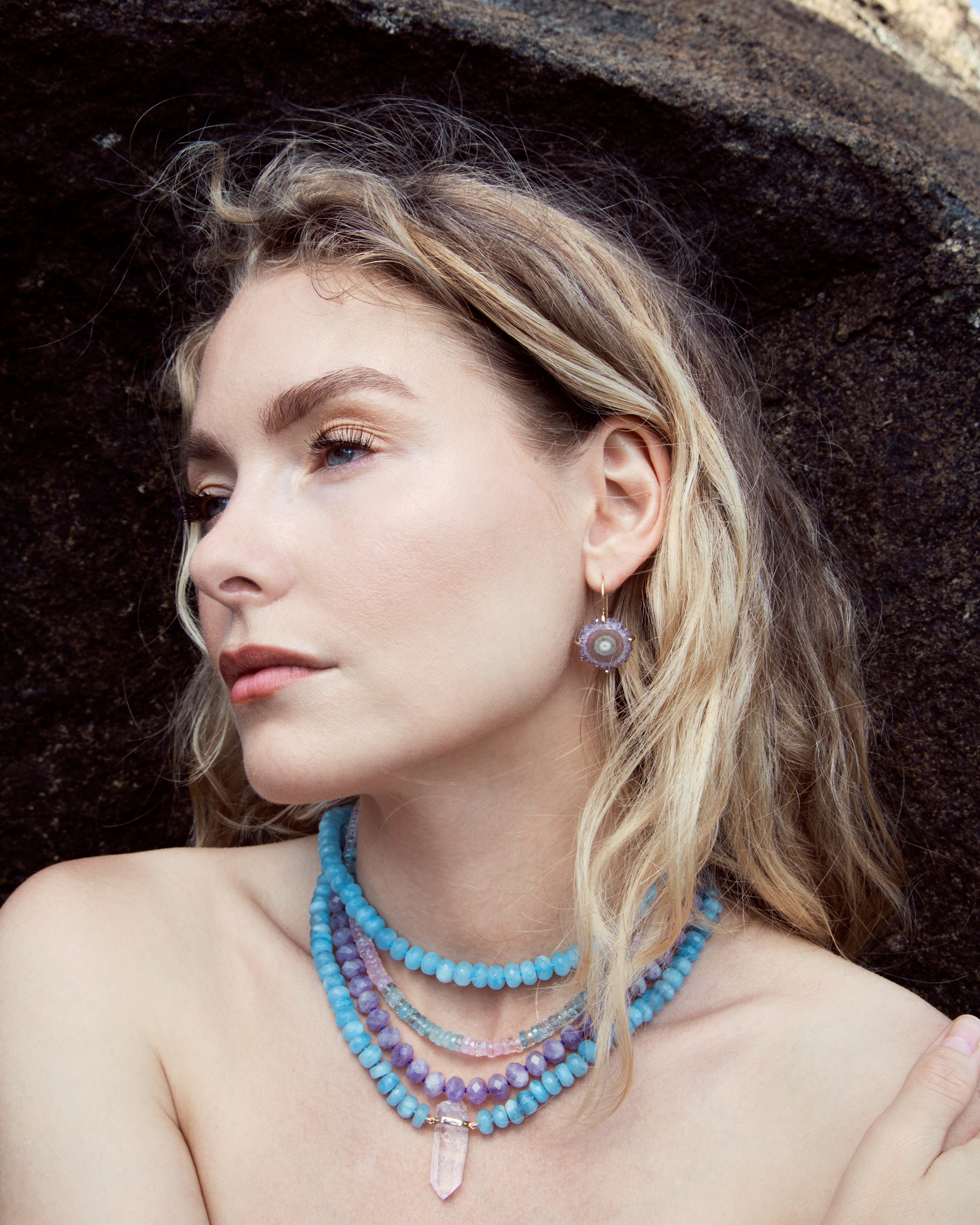 Each beaded jewelry piece is hand strung from the highest quality materials that are cut from natural mineral sources. They are sensitive to prolonged exposure to hairsprays and scents. To ensure longevity please be gentle and avoid tugging and pulling of these pieces.