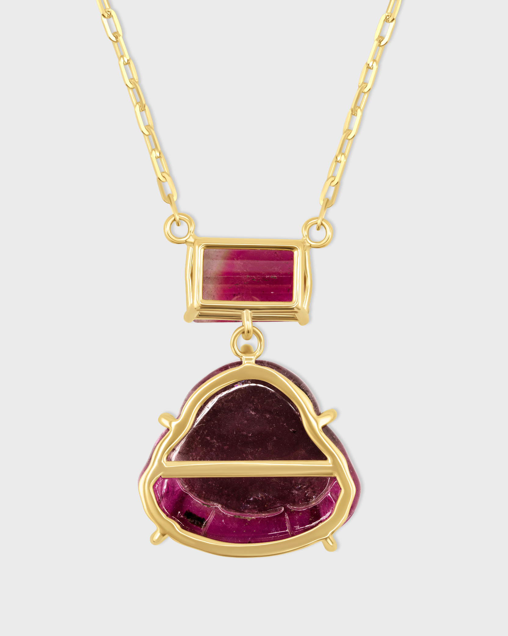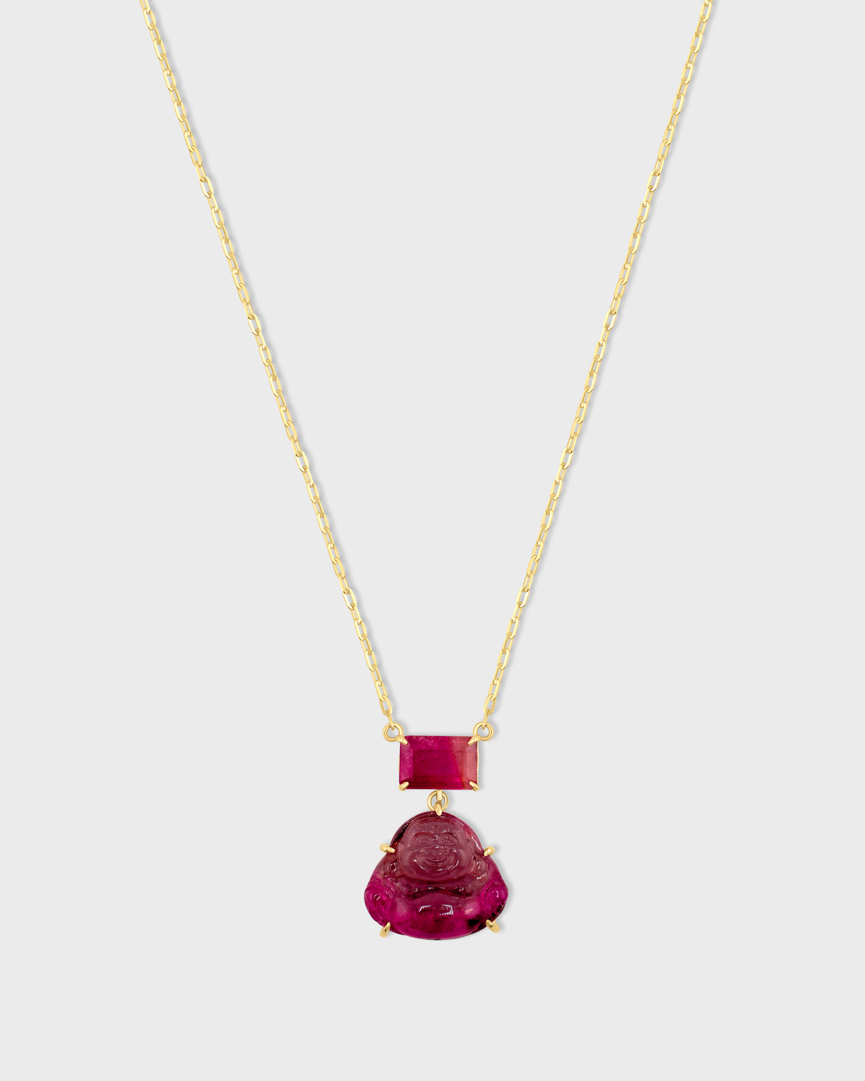 This charming necklace features a smiling Buddha carved from pink tourmaline gemstone adorned with a pink tourmaline gemstone crown.