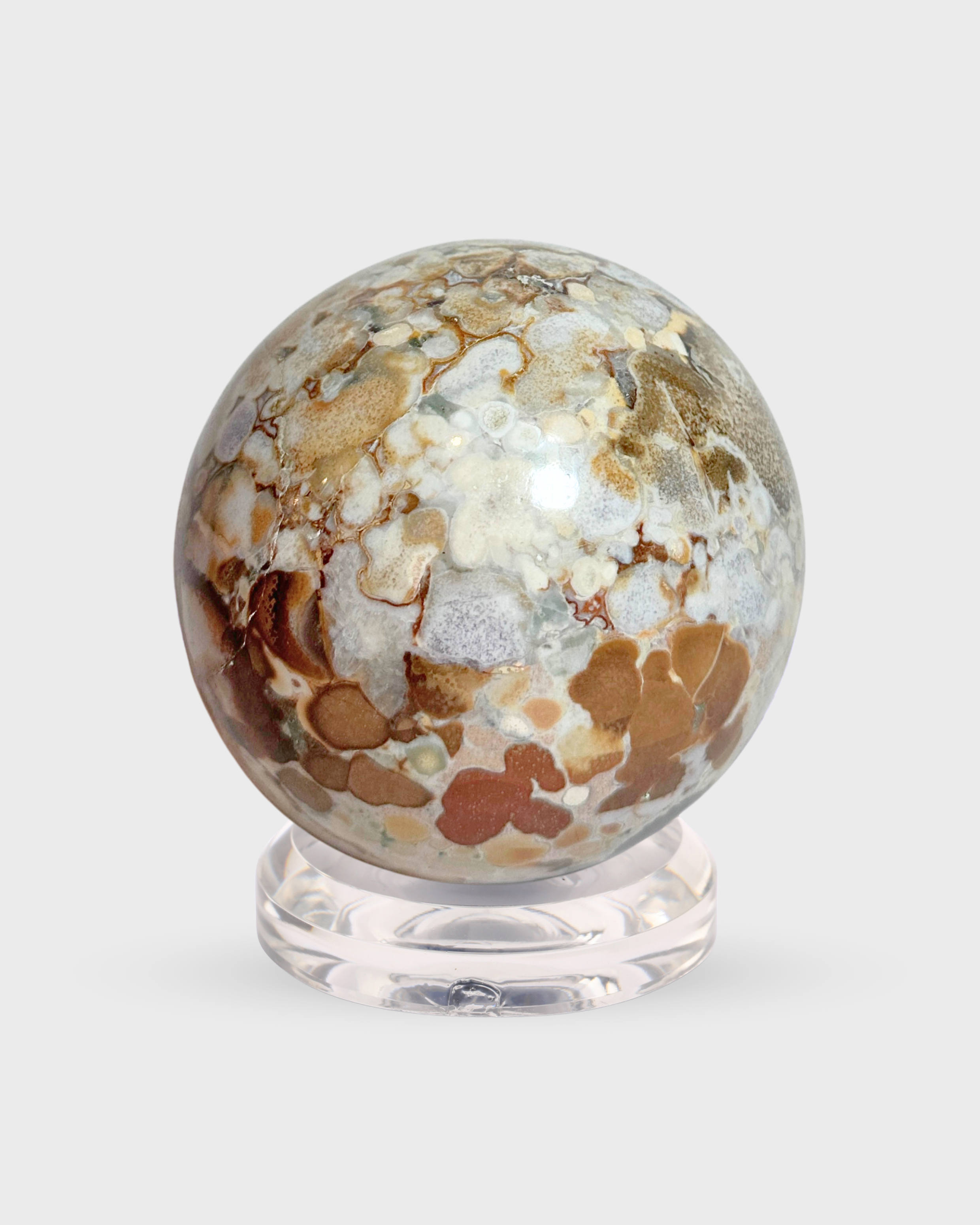 Organic patterns in earthy browns and creams bring warmth and grounding to this Leopard Jasper sphere. A beautiful reflection of nature’s raw artistry and stability.
