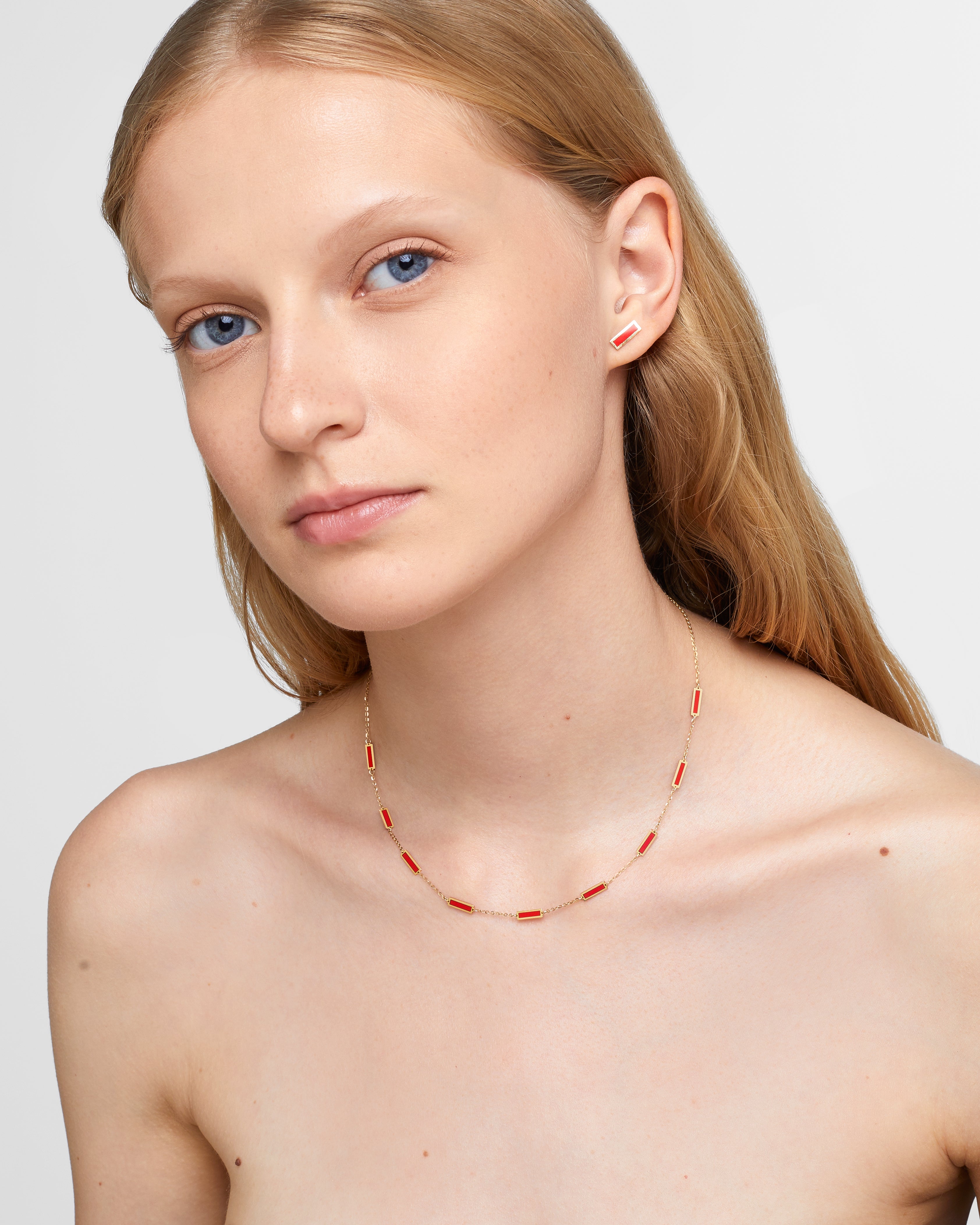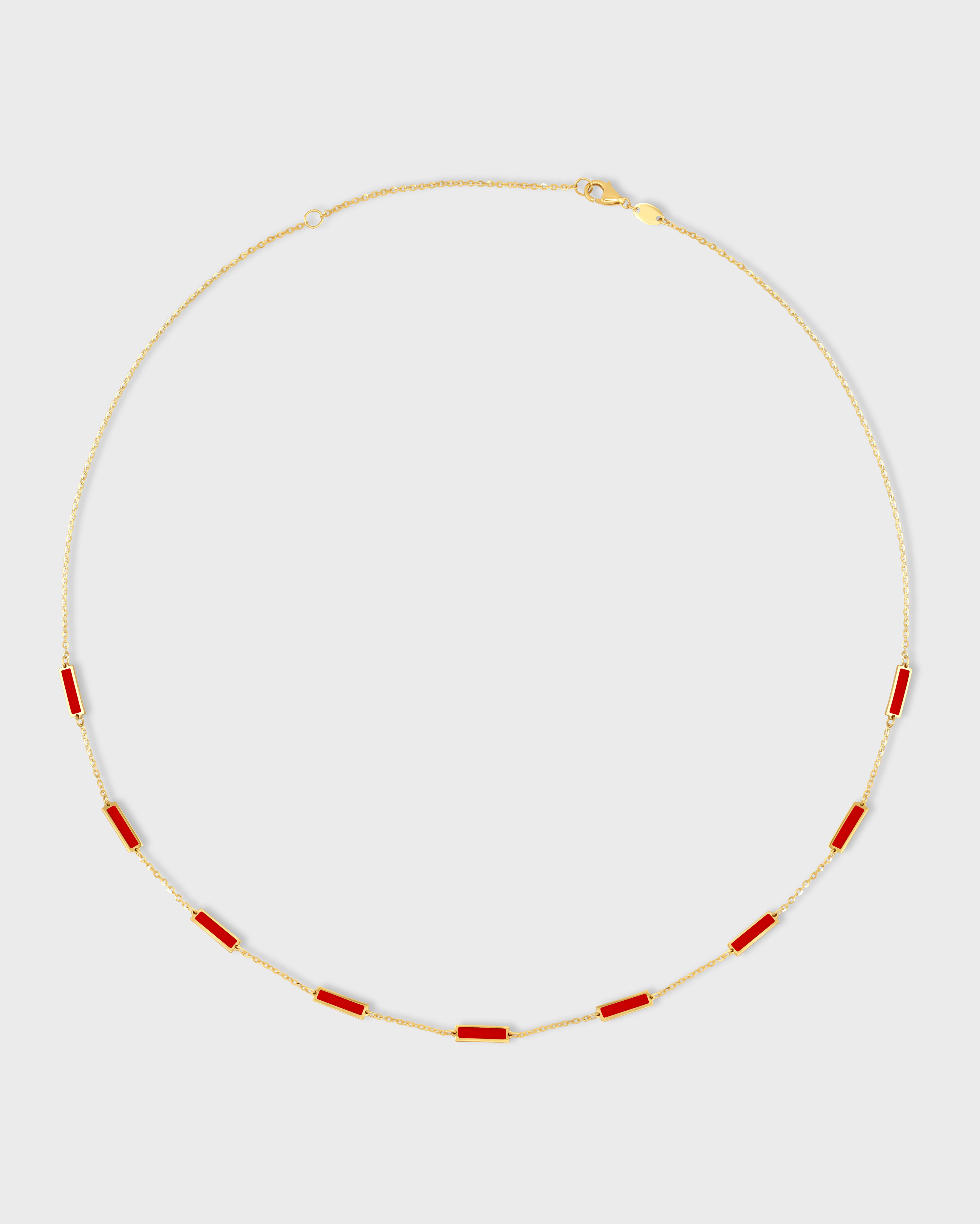 This refined piece incorporates a delicate chain linking the coral bars, creating a harmonious balance between the warm golden hue and deep red accents.