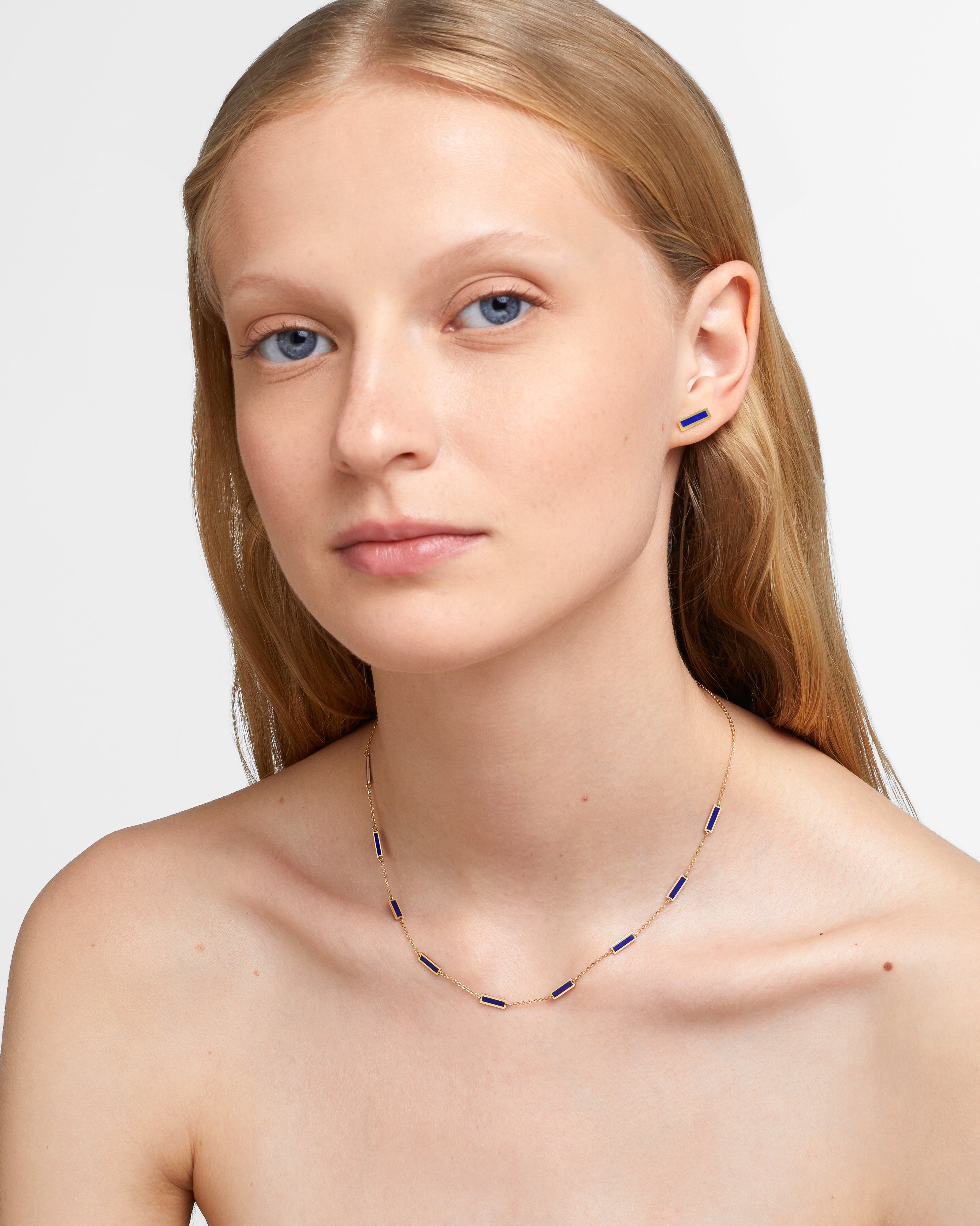 The necklace features a delicate gold chain interspersed with small rectangular Lapis bars, creating a minimalist yet sophisticated look.
