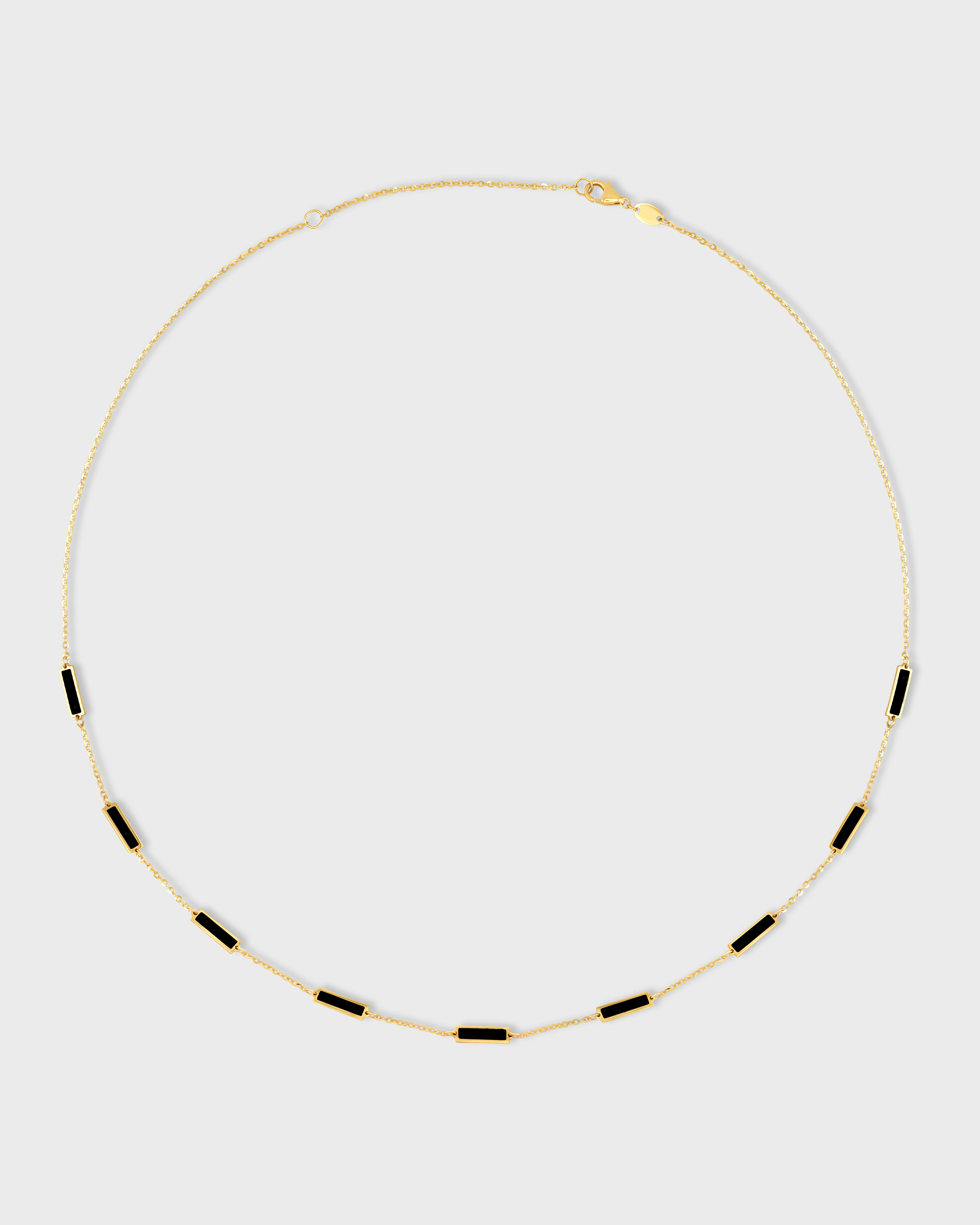 The necklace features a delicate gold chain interspersed with small rectangular onyx bars, creating a minimalist yet sophisticated look.