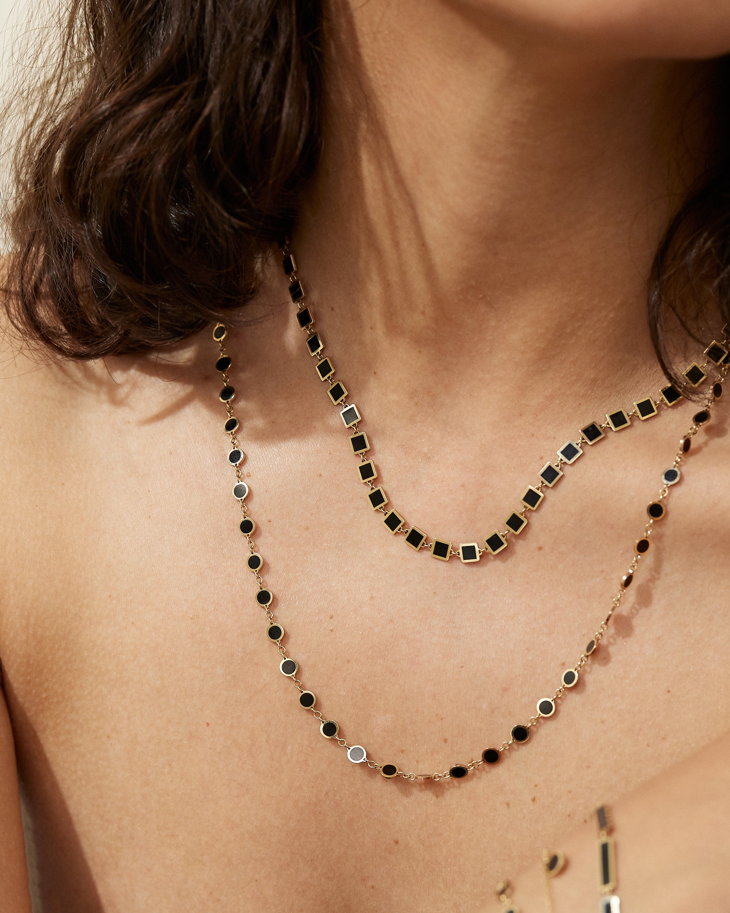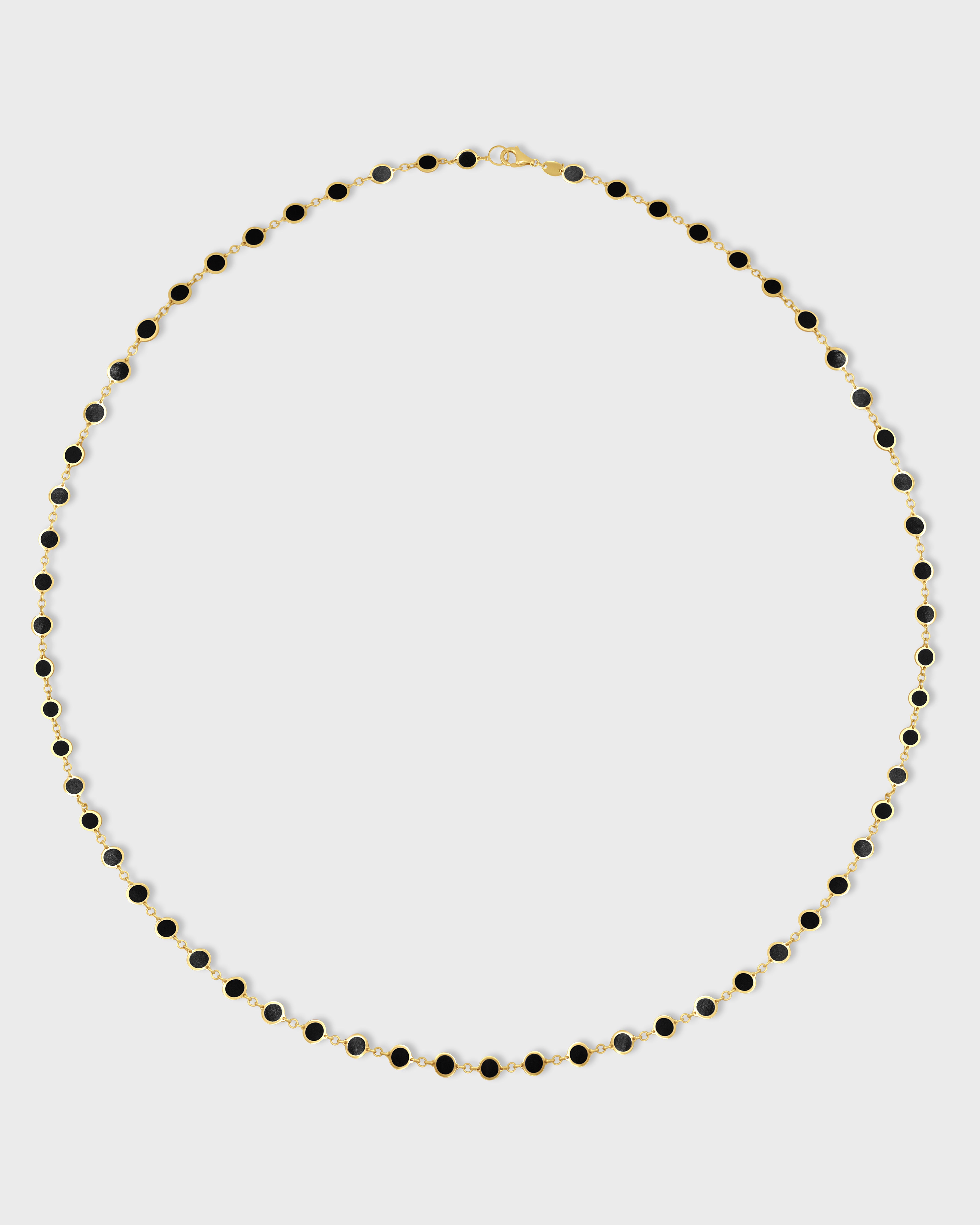 A stunning piece handcrafted with precision in New York City showcasing a series of perfectly round black onyx inlays, each encased in gleaming gold circles.