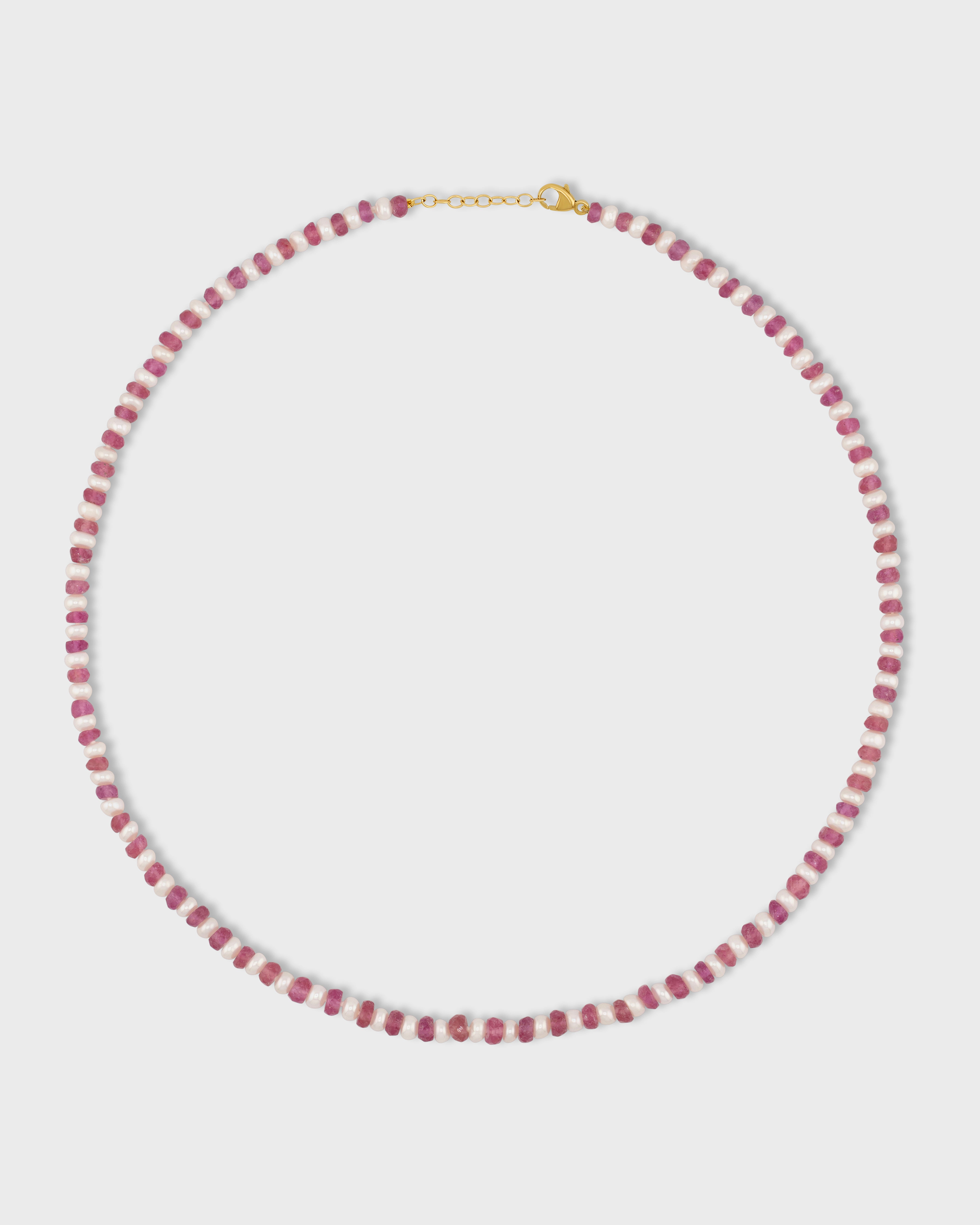 Classic 4mm sized freshwater pearl necklace mixed with pretty pink sapphires. Hand strung with silk in NYC and finished with 14 karat gold hardware.