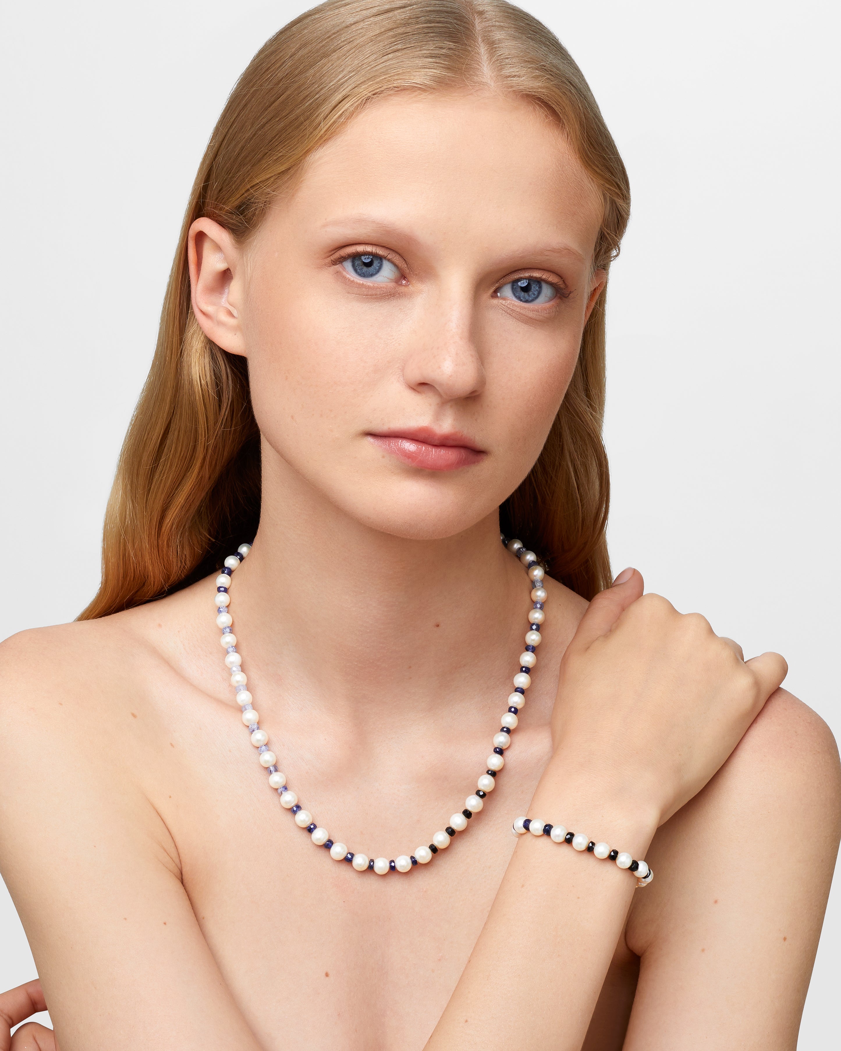 Freshwater pearls and vibrant blue sapphire crystals hand strung in New York City and finished with 14 karat yellow gold.