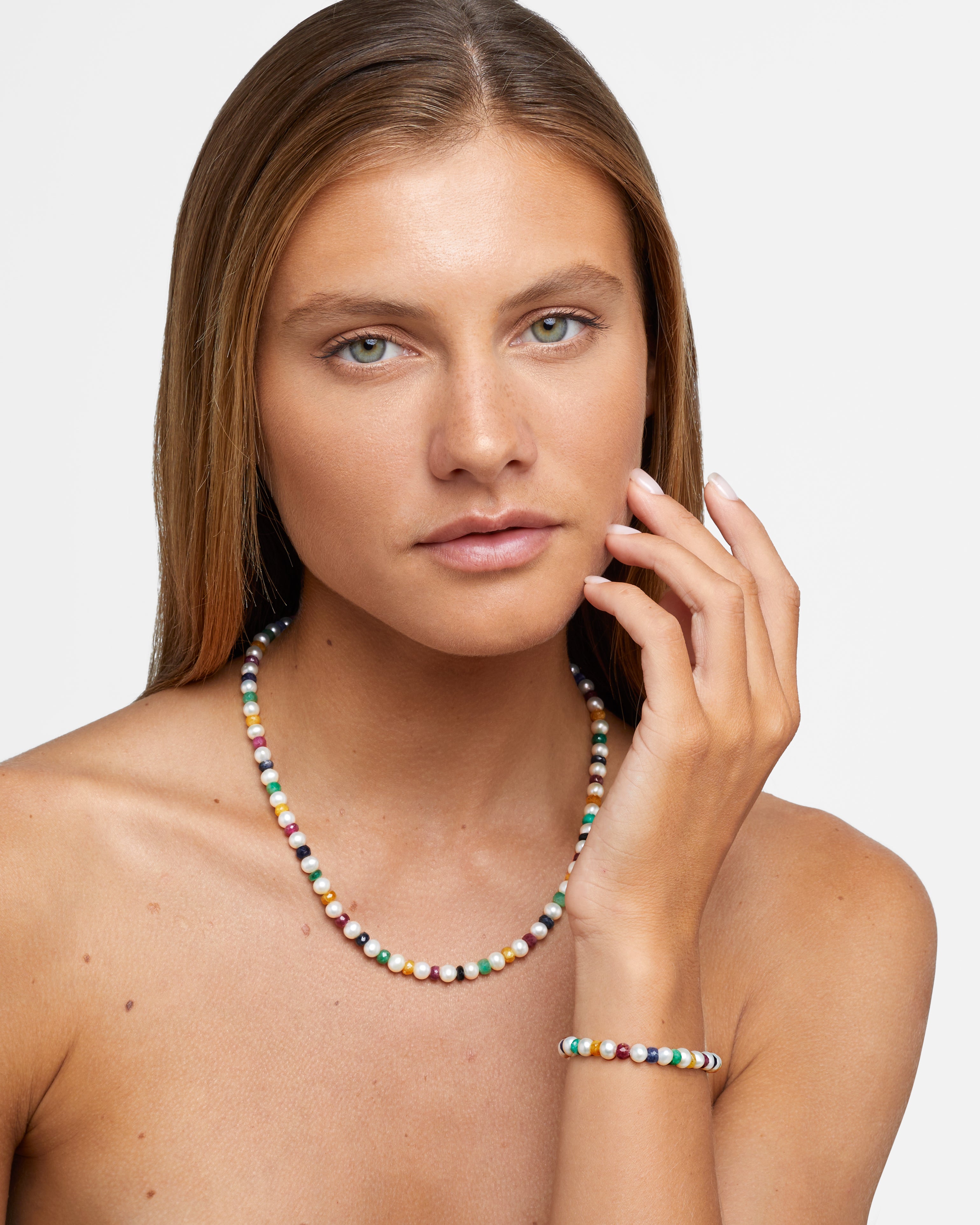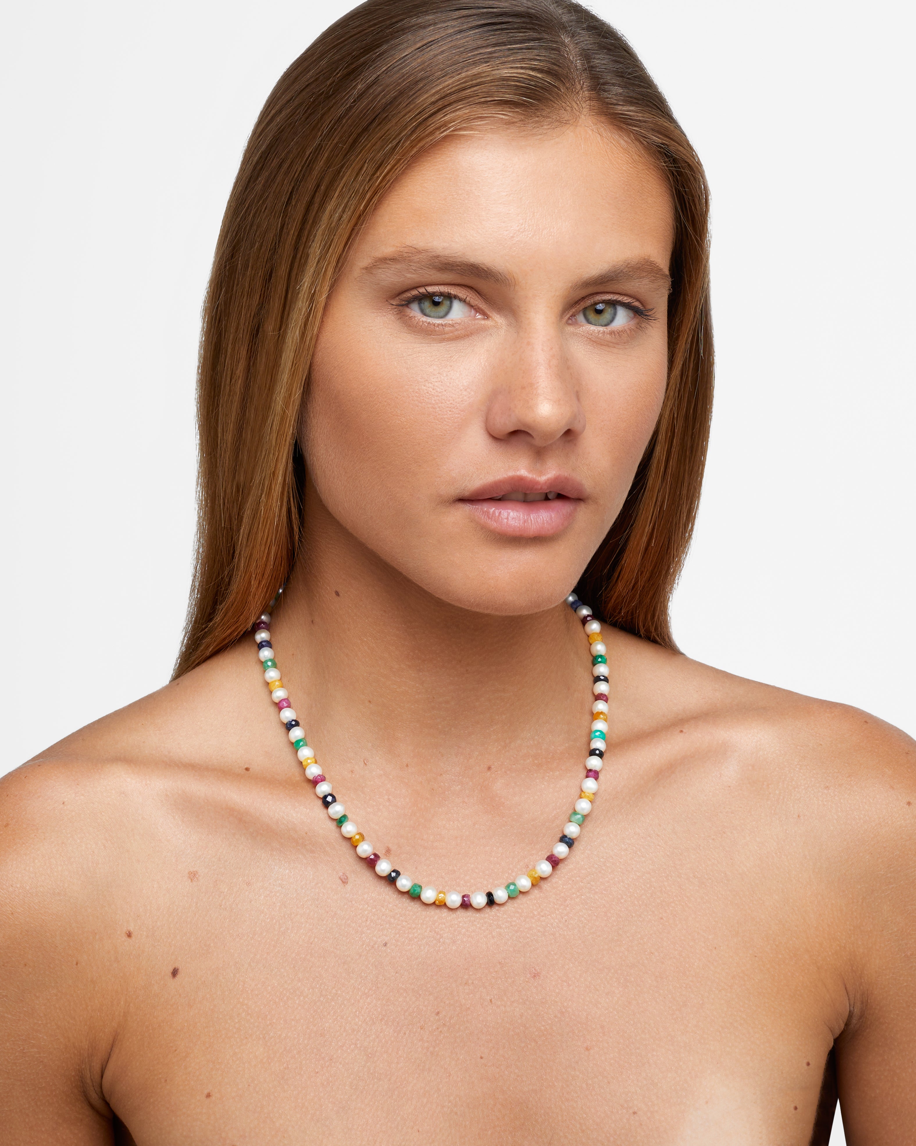 Freshwater pearls and vibrant rainbow sapphire crystals hand strung in New York City and finished with 14 karat yellow gold.