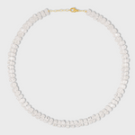 This crystal quartz necklace featuring clear, polished quartz beads and a gold clasp with an adjustable chain.