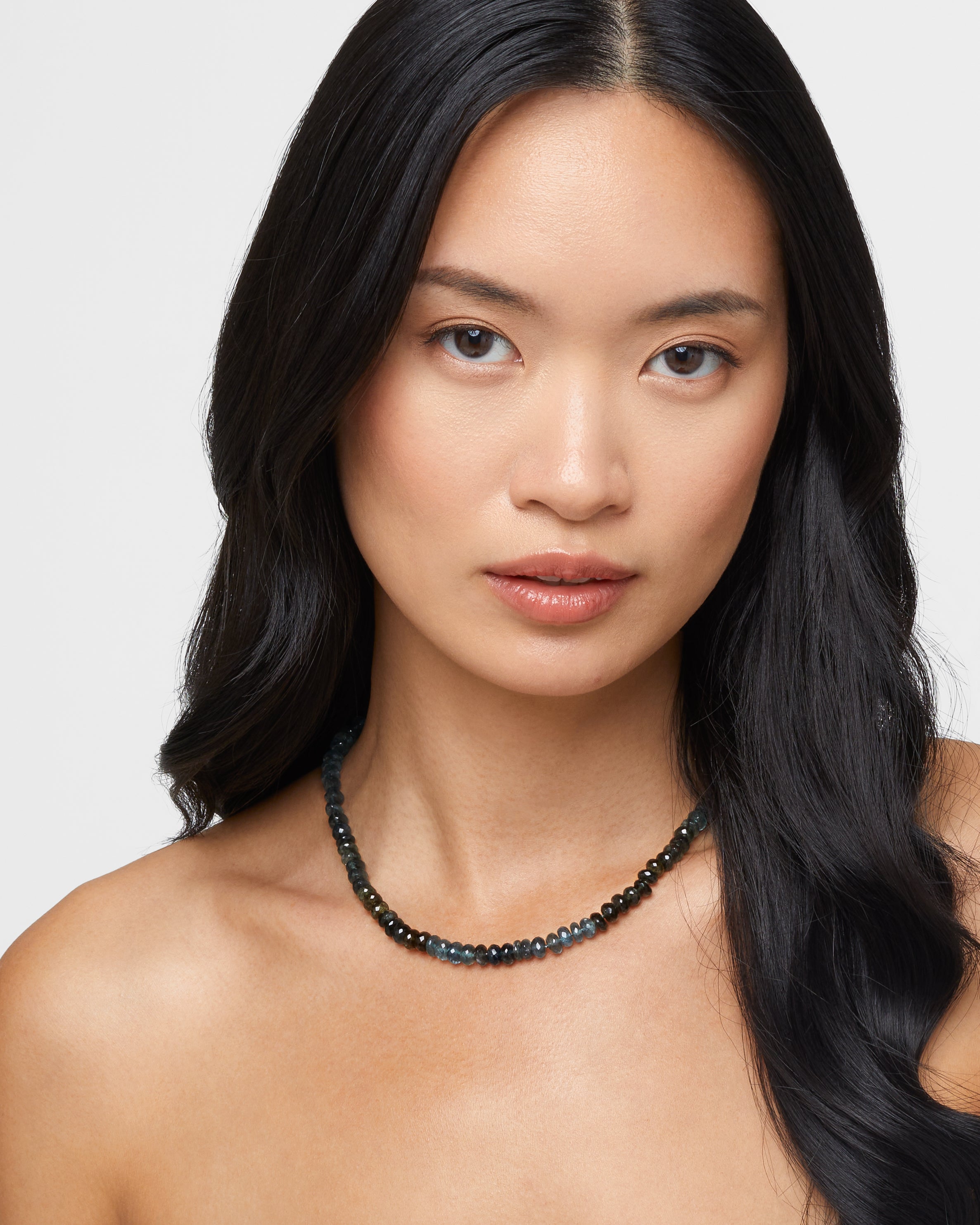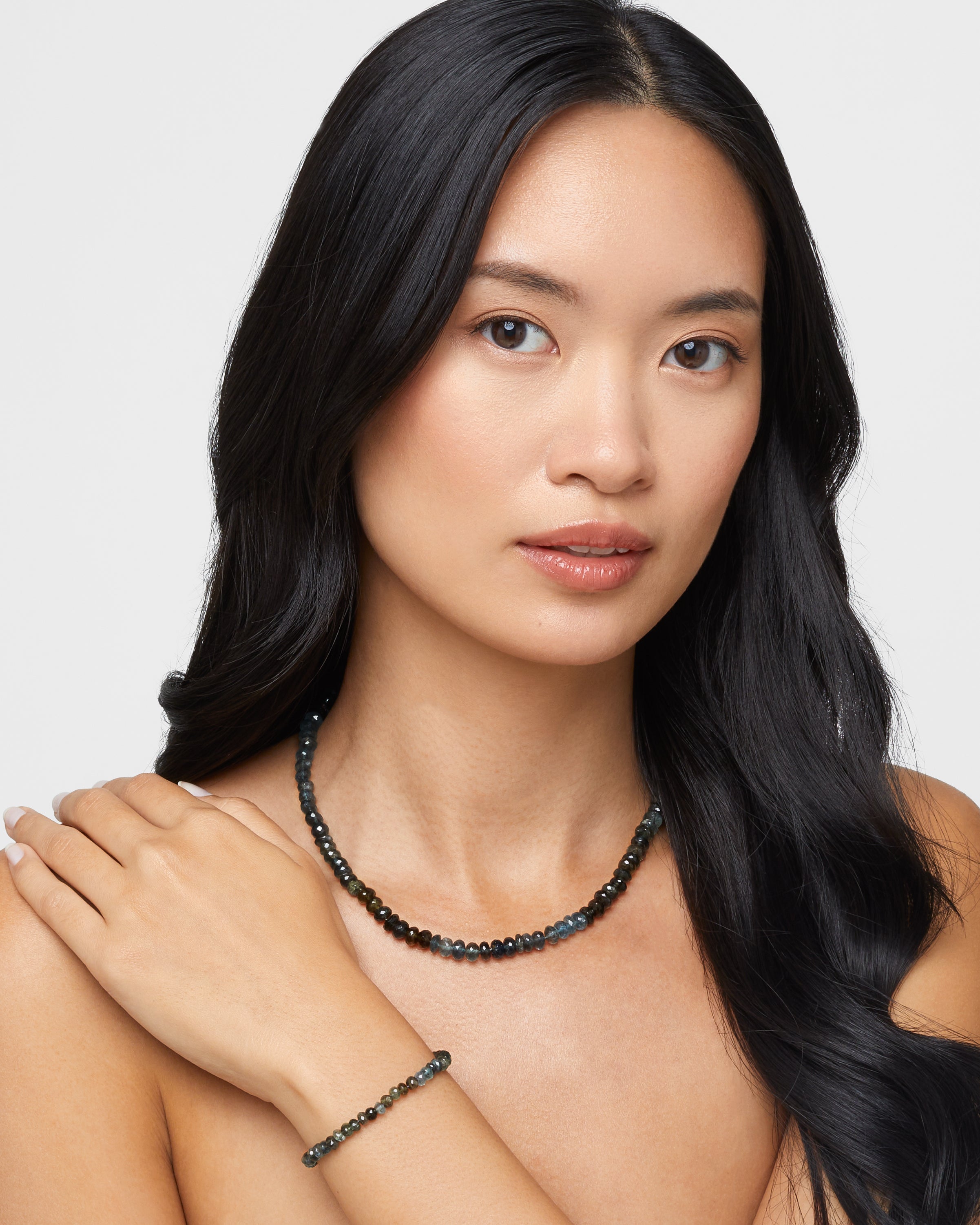 Featuring shades of deep ocean blues and earthy greens, this necklace evokes the mystery and calm of the sea. Each bead is thoughtfully cut to highlight the raw beauty of aquamarine, symbolizing tranquility and courage.