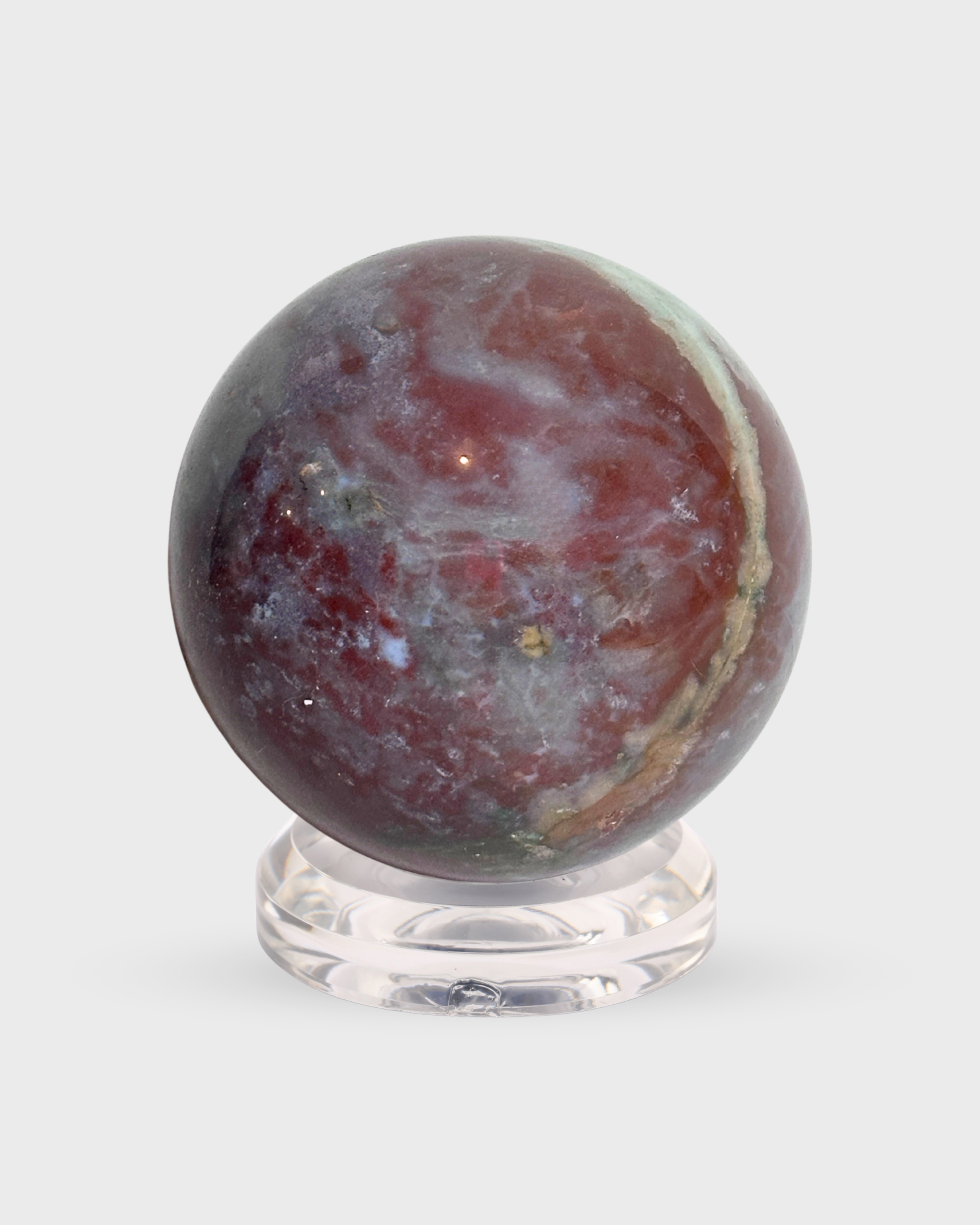 Swirls of crimson and sage intertwine within this Red Moss Agate sphere, reflecting the grounding beauty of nature. A symbol of growth, renewal, and connection to the earth.