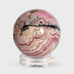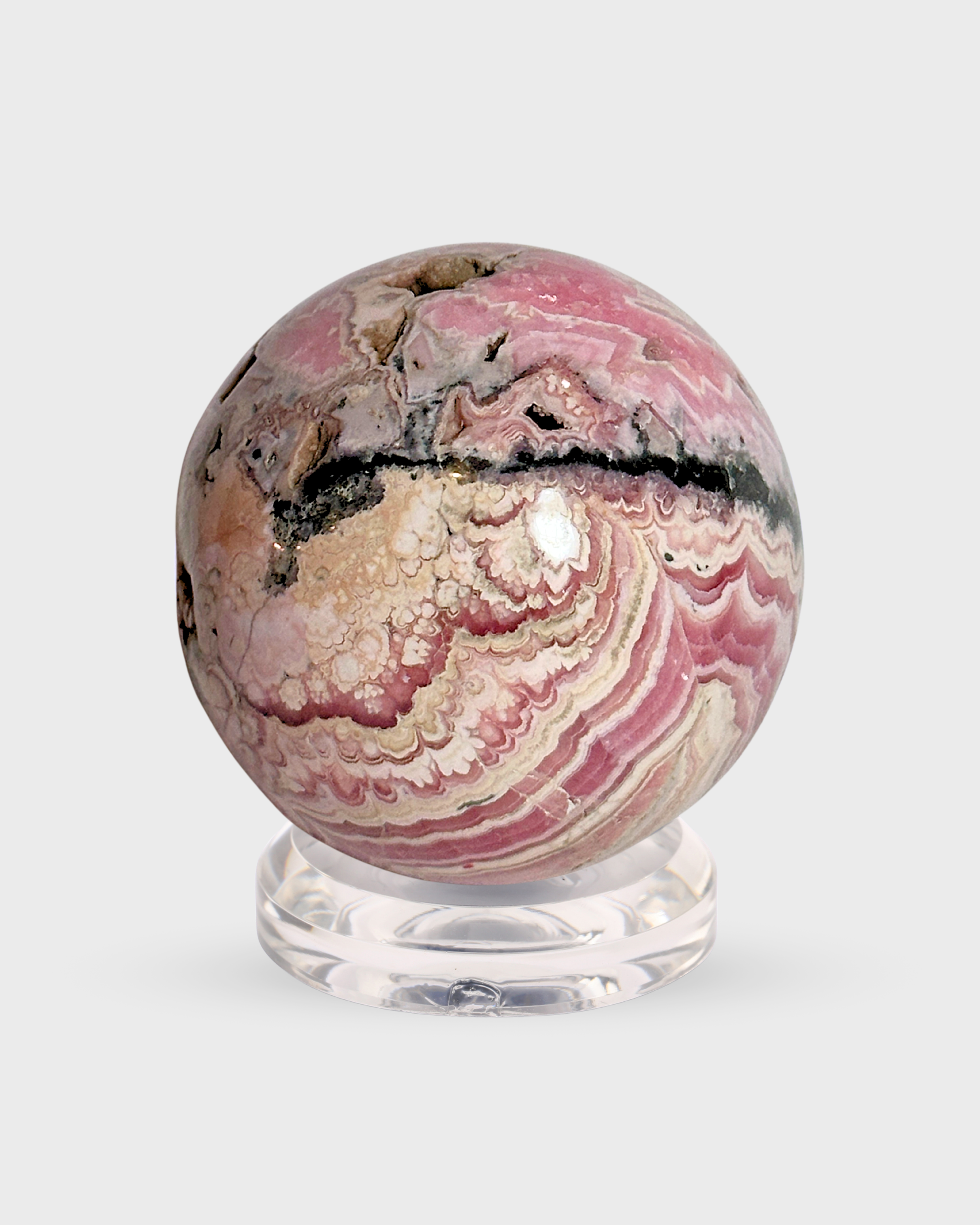 Delicate pink bands and intricate layers make this Rhodochrosite sphere a treasure of love and compassion. A radiant piece that uplifts the heart and harmonizes energy.