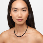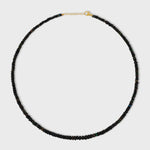 Mini black opals, iridescent with dazzling flashes of color, hand strung in the heart of New York City and finished with 14 karat yellow gold.