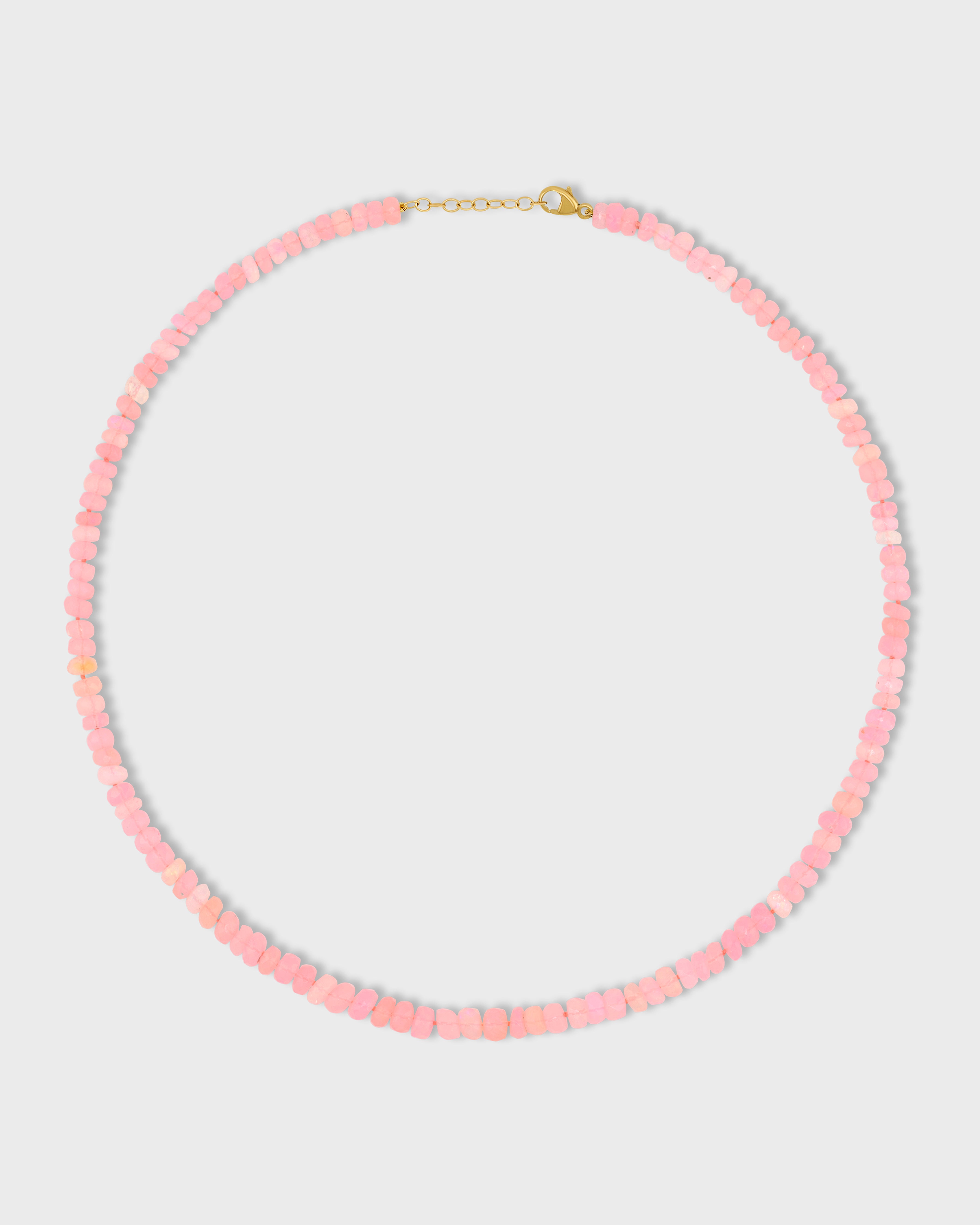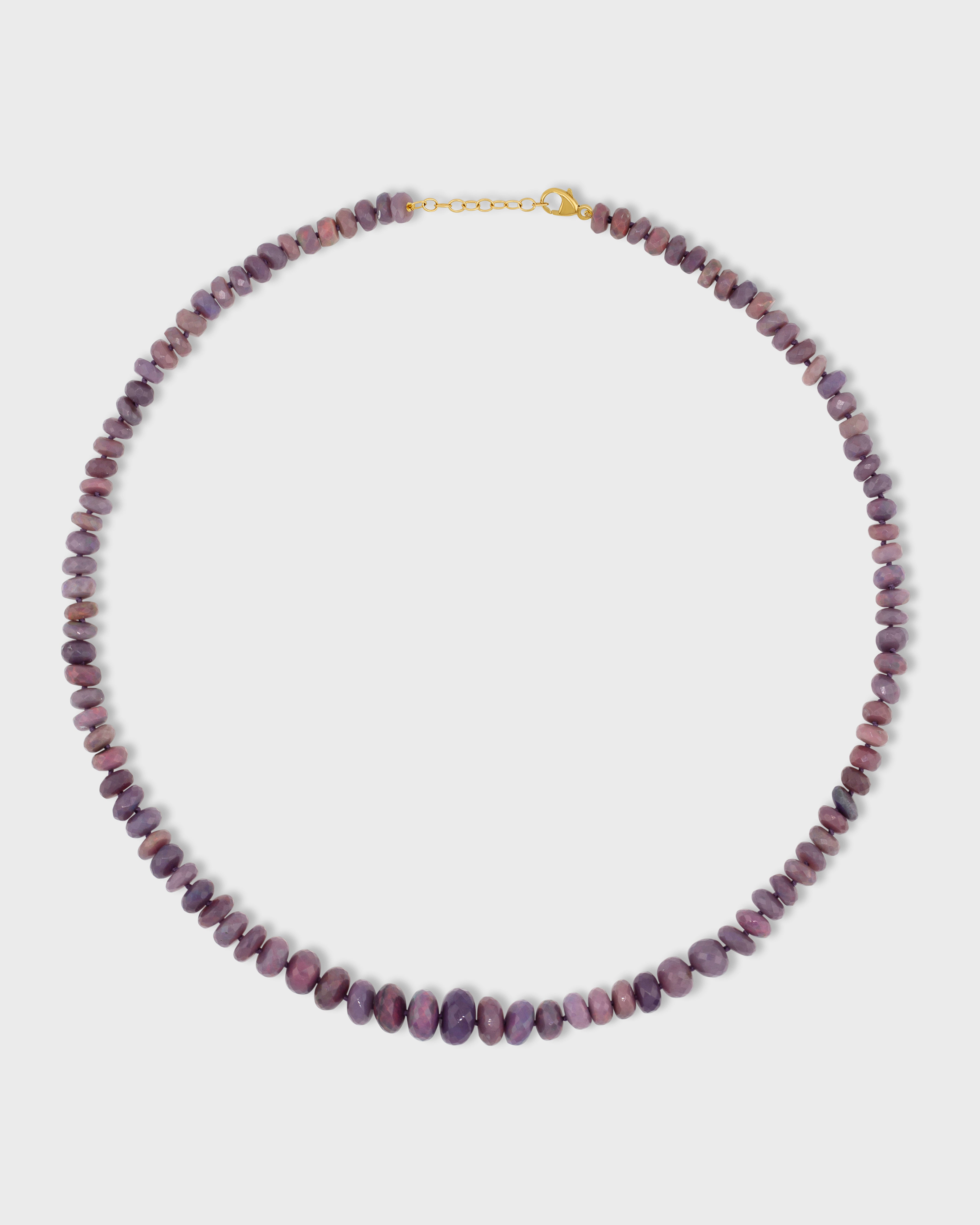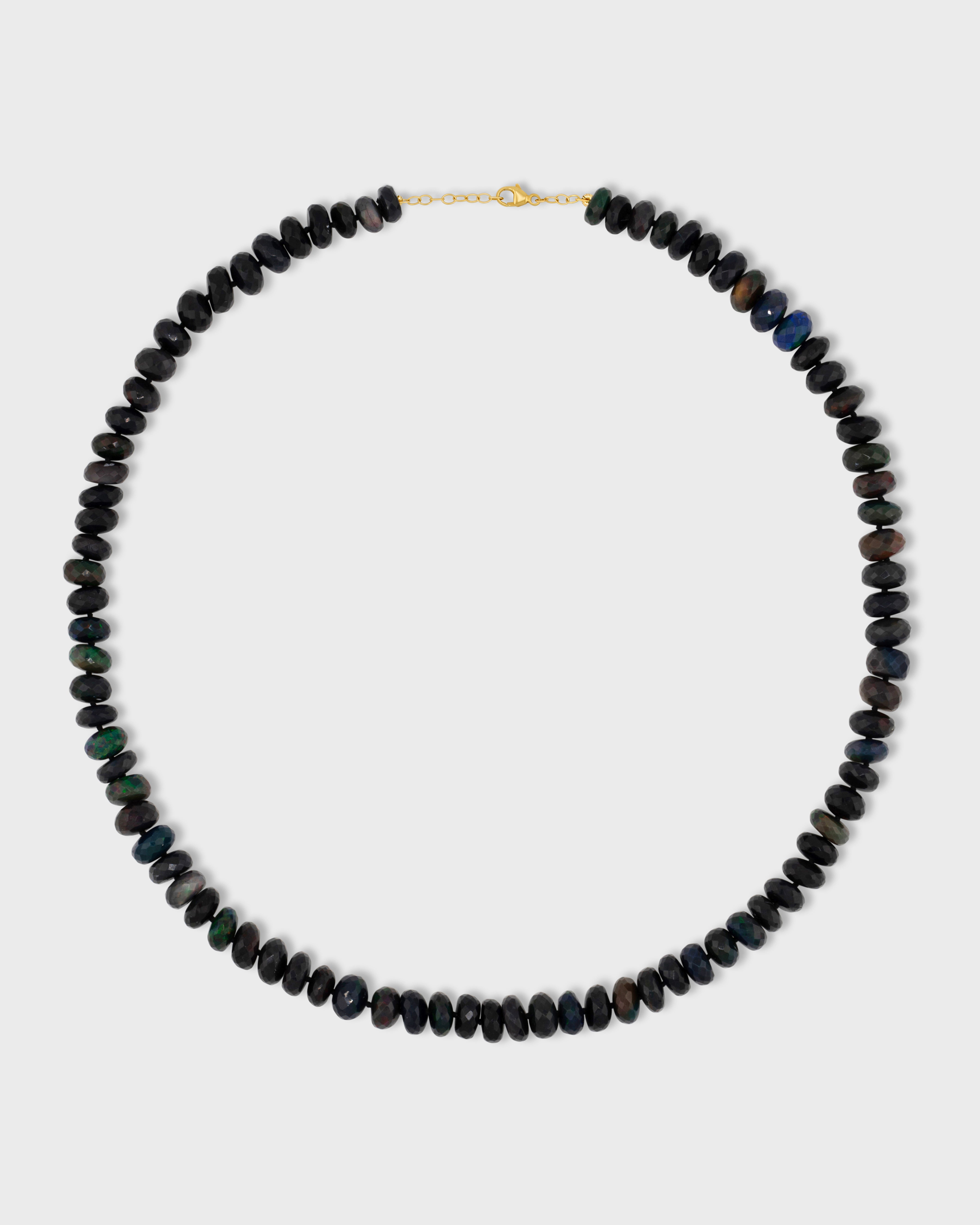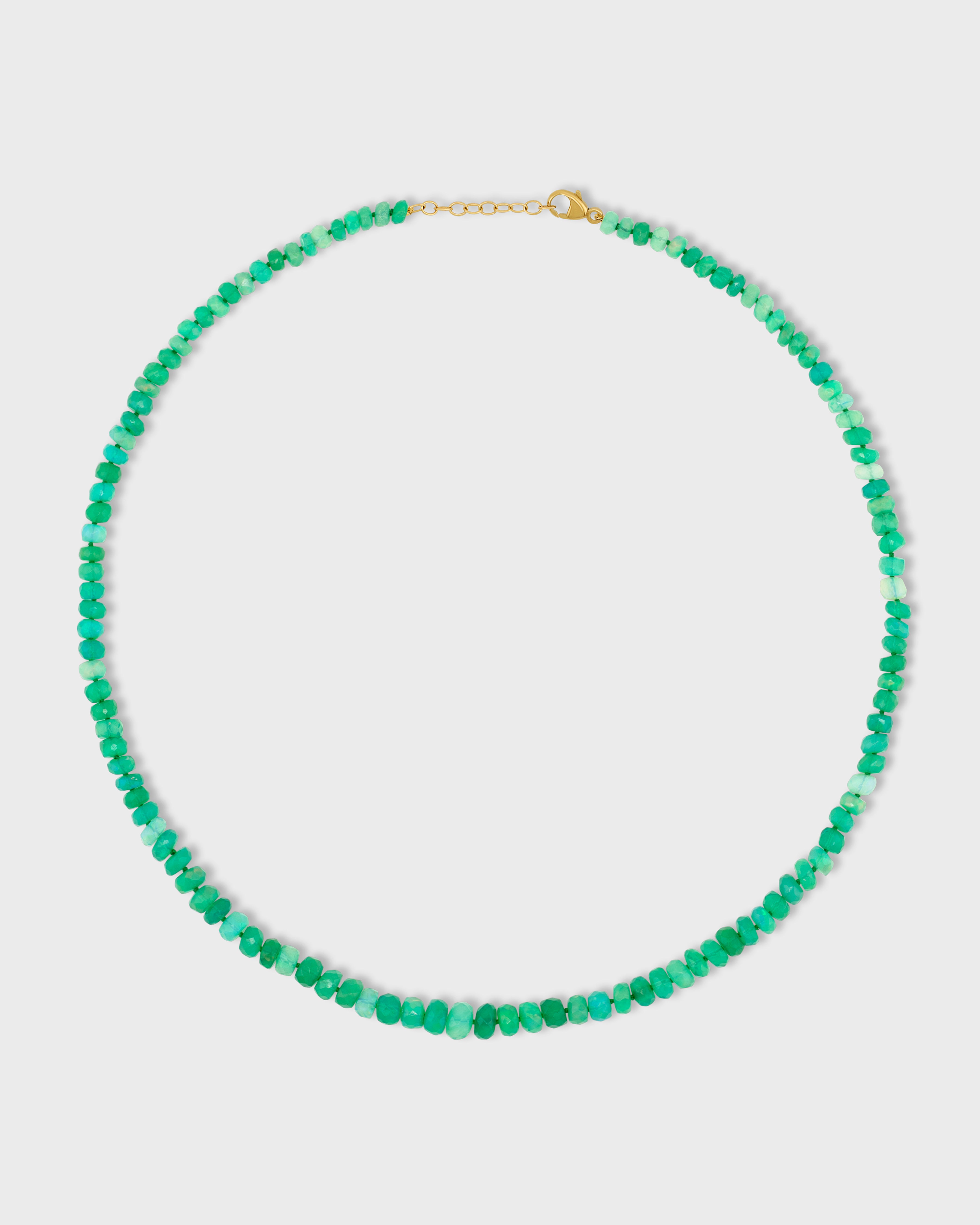 Bright green large opals faceted cut necklace hand strung in New York City and finished with 14 karat yellow gold.