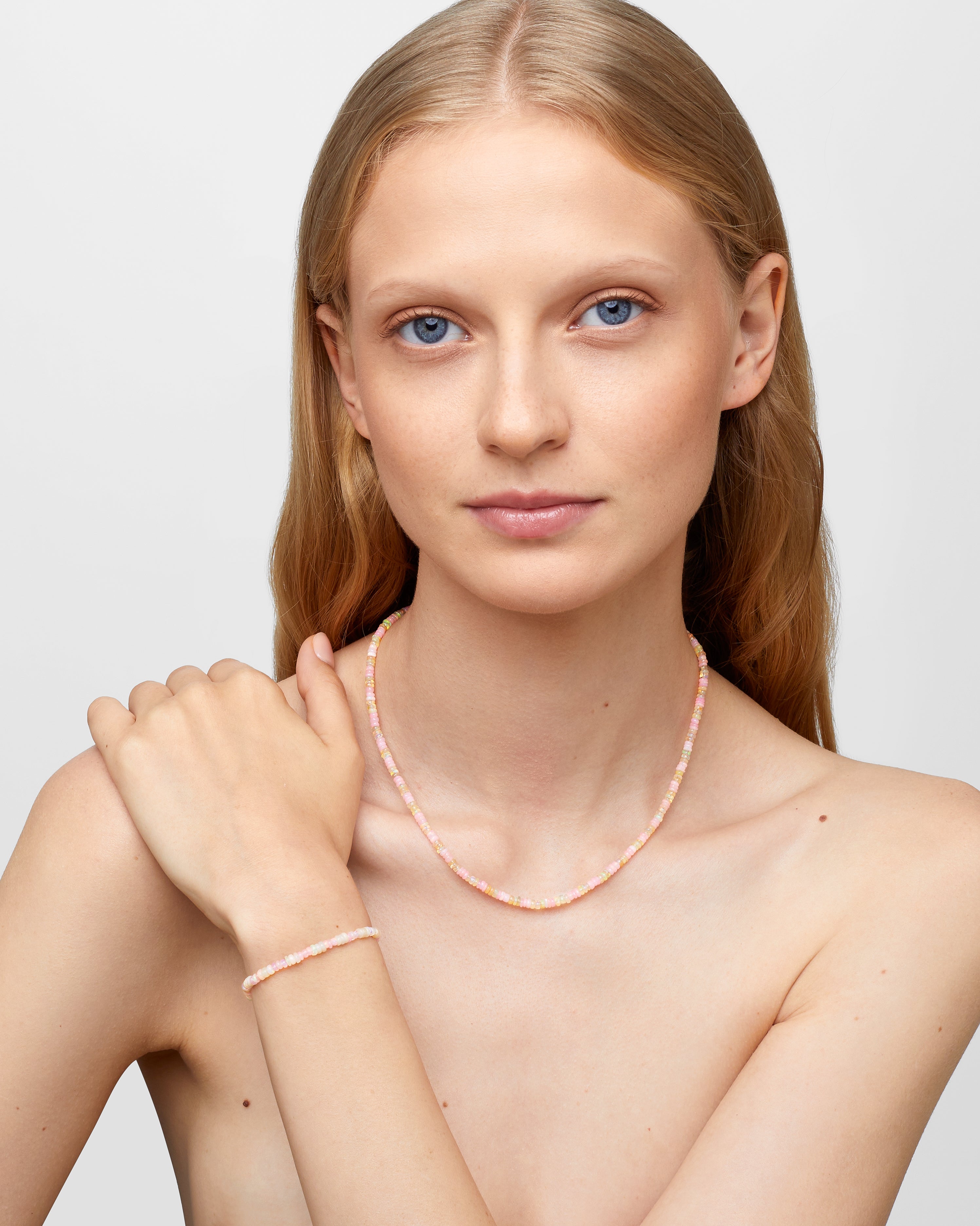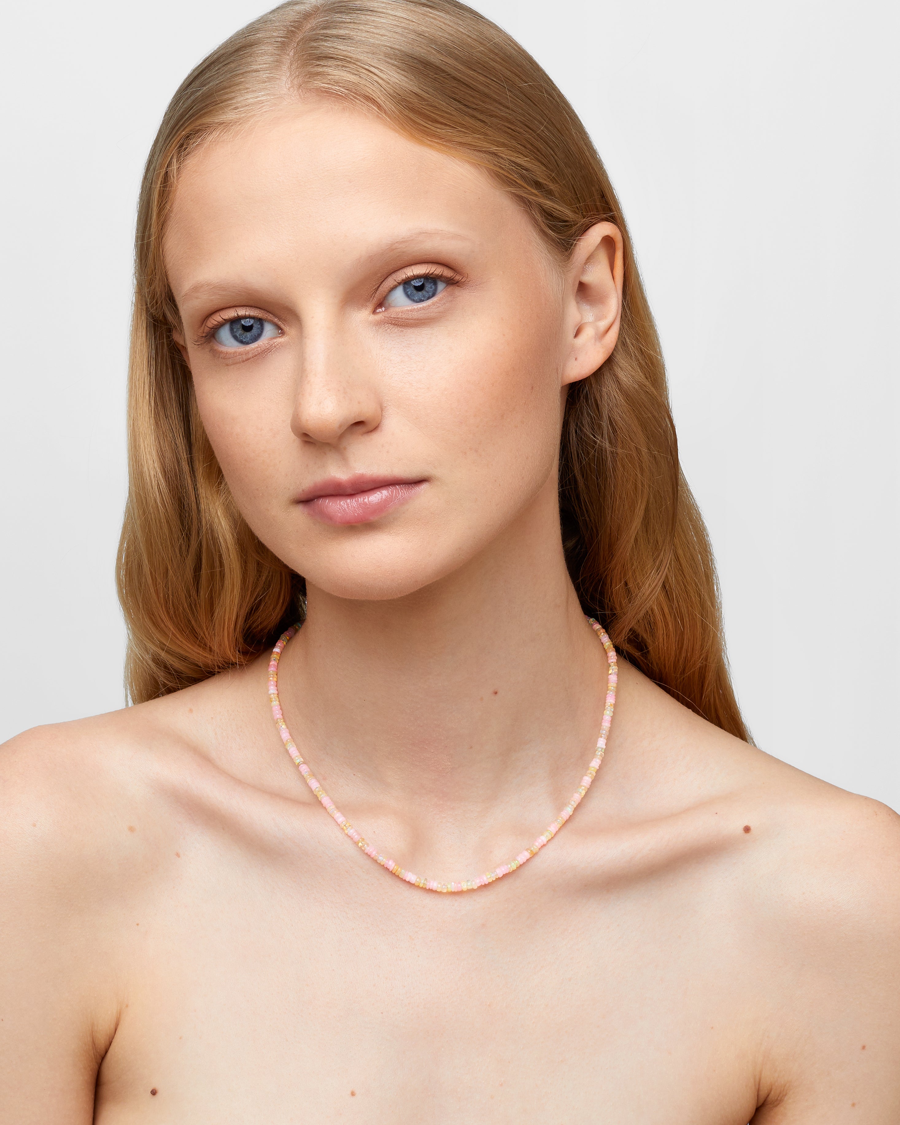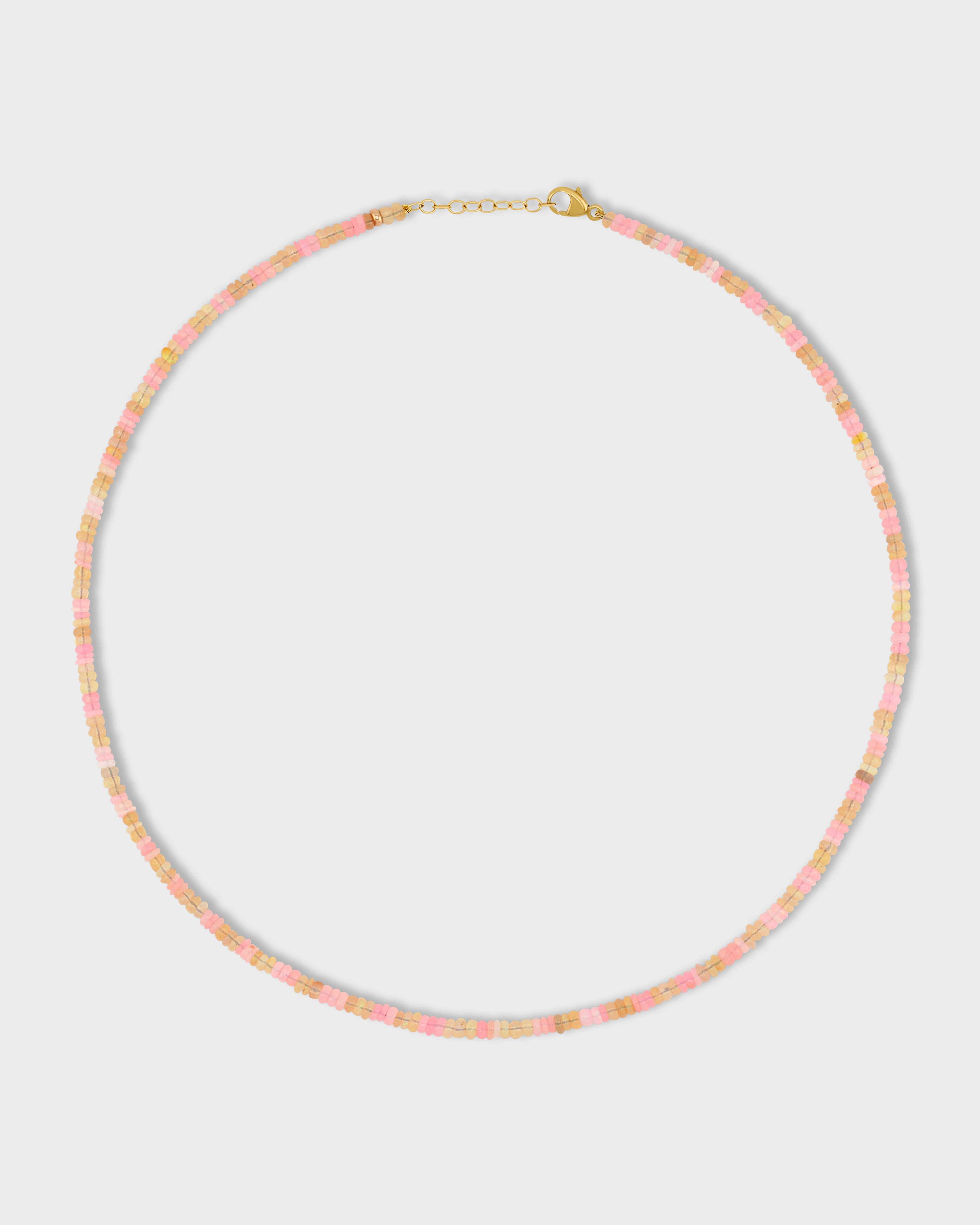 Pink and yellow opals hand strung in New York City and finished with 14k yellow gold.
