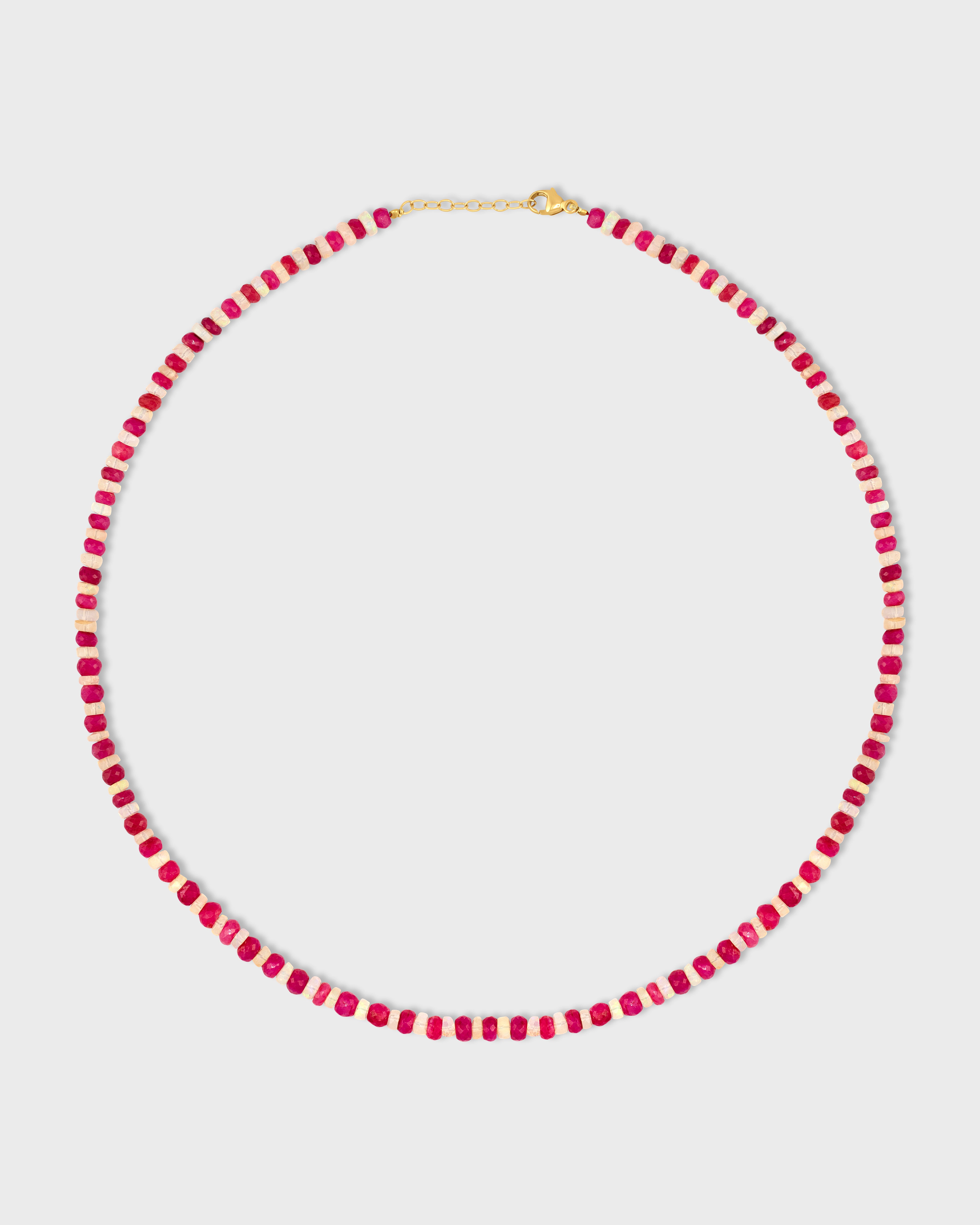 This beautiful necklace features a harmonious blend of pink sapphire and opal beads, creating a soft yet striking piece. The delicate tones of pink with the opals’ natural shine make it a perfect accessory for a refined and timeless look.