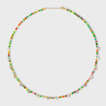 A playful and colorful necklace featuring a mix of vibrant beads in various shades, reminiscent of candy drops. The necklace is adorned with delicate opal and labradorite gemstones, adding a touch of elegance and sparkle.