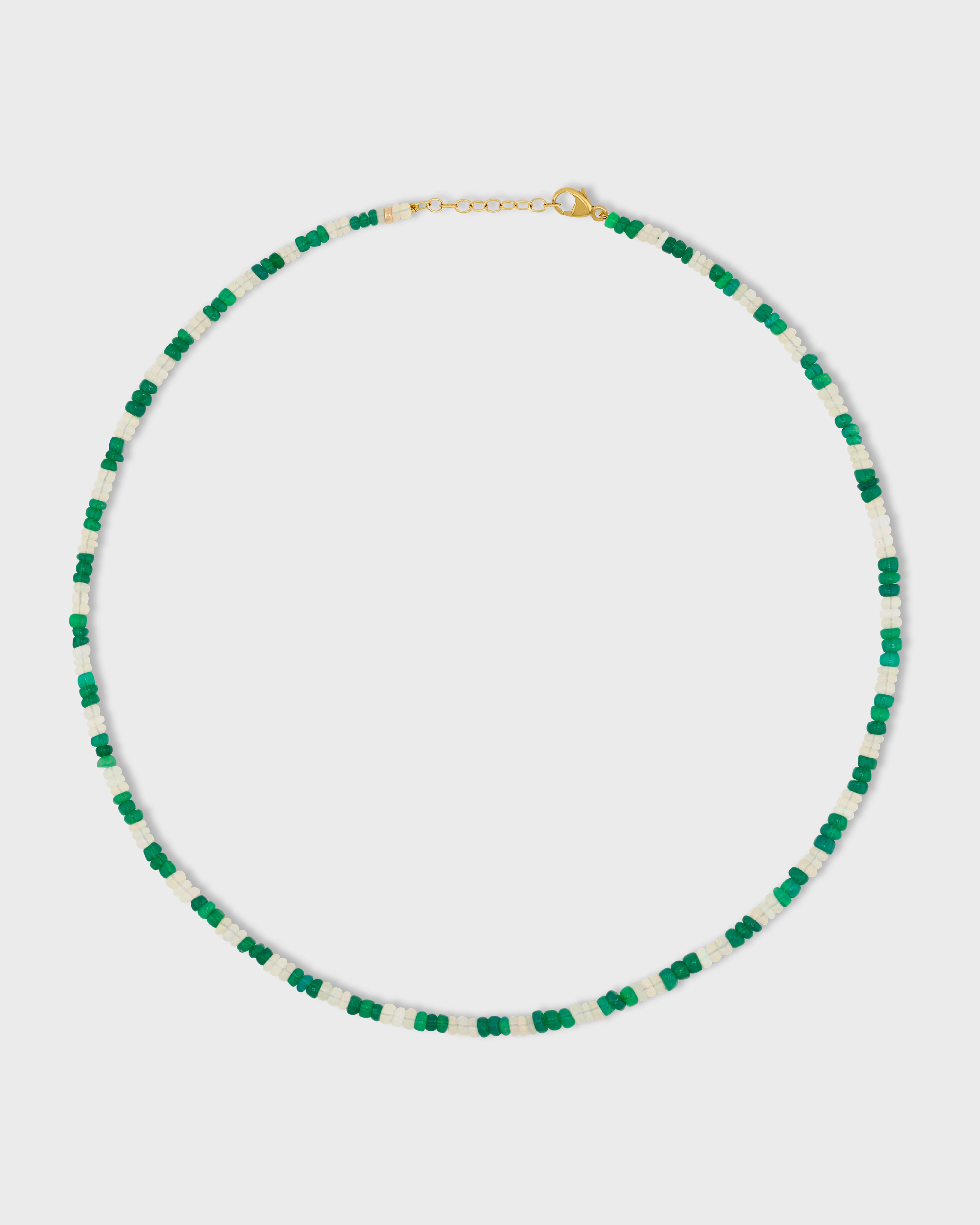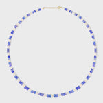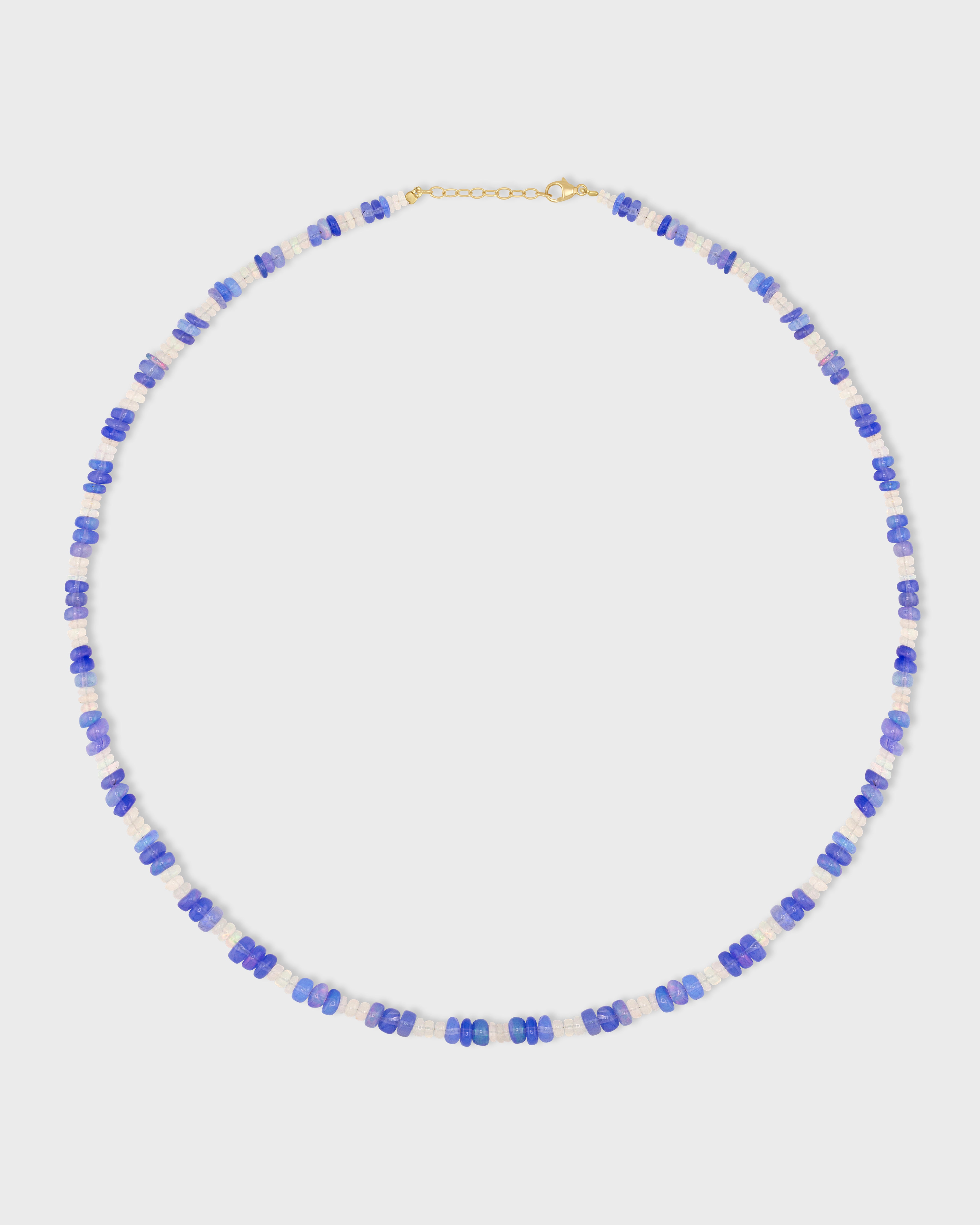 Violet and white opals hand strung in New York City and finished with 14k yellow gold.