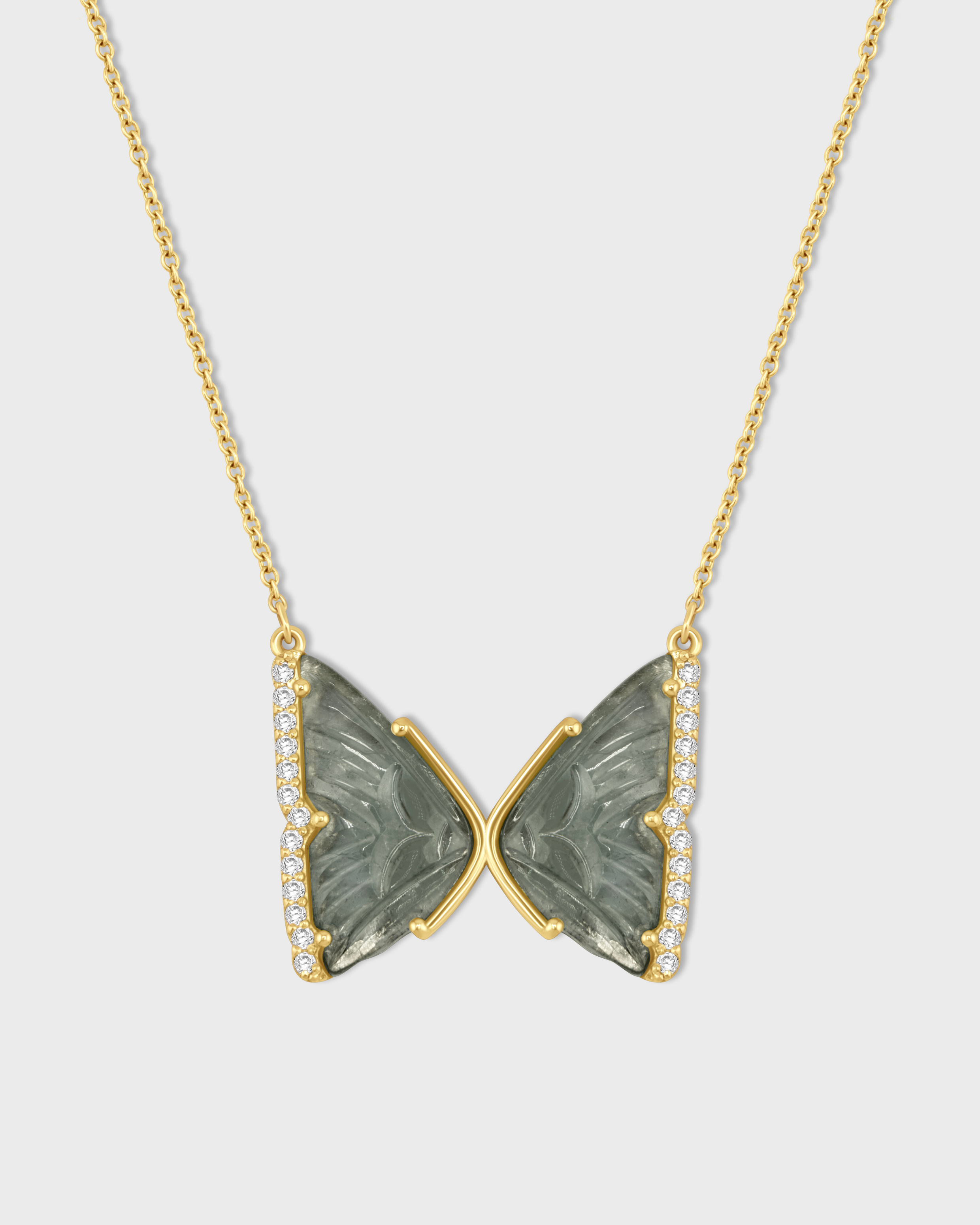 The Aquamarine Diamond Butterfly Necklace features delicately carved aquamarine stones shaped into a butterfly, framed with shimmering diamonds. Set in 18K yellow gold, this piece symbolizes transformation and beauty, capturing the essence of both nature and elegance.
