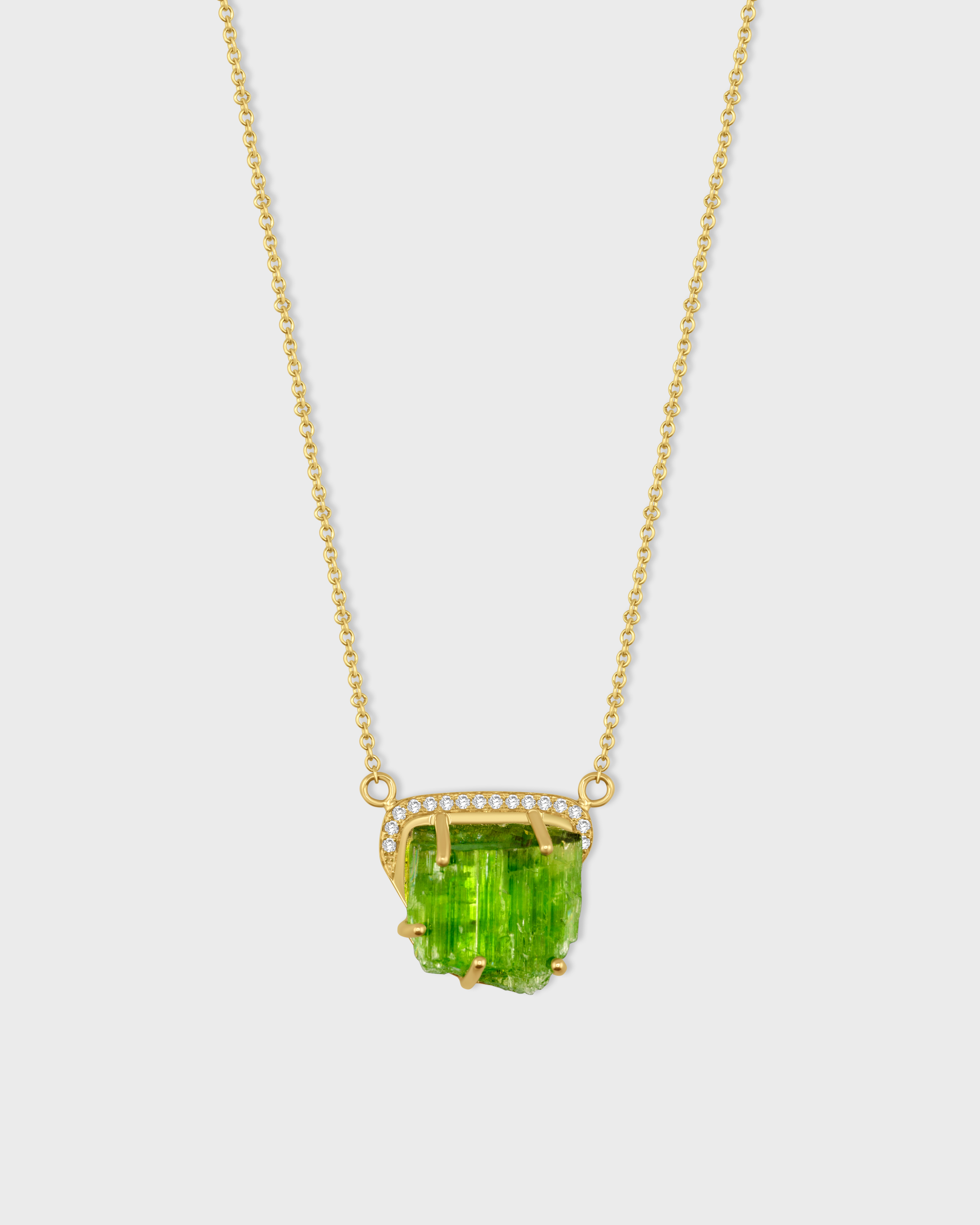 Stunning 14k gold necklace featuring a raw tremolite crystal crowned with sparkling diamonds.